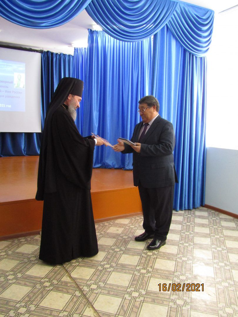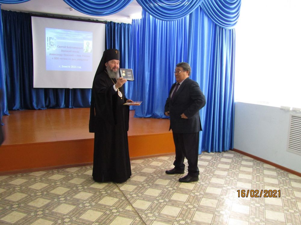 Во второй части встречи Архиепископ Элистинский и Калмыцкий Юстиниан наградил директора филиала Э.Л. Пашнанова юбилейным знаком «25 лет Элистинской епархии» за плодотворное сотрудничество и значительный вклад в поддержку религиозных общин Республики Калмыкия в честь 25-летия образования Элистинской и Калмыцкой Епархии Русской Православной Церкви.