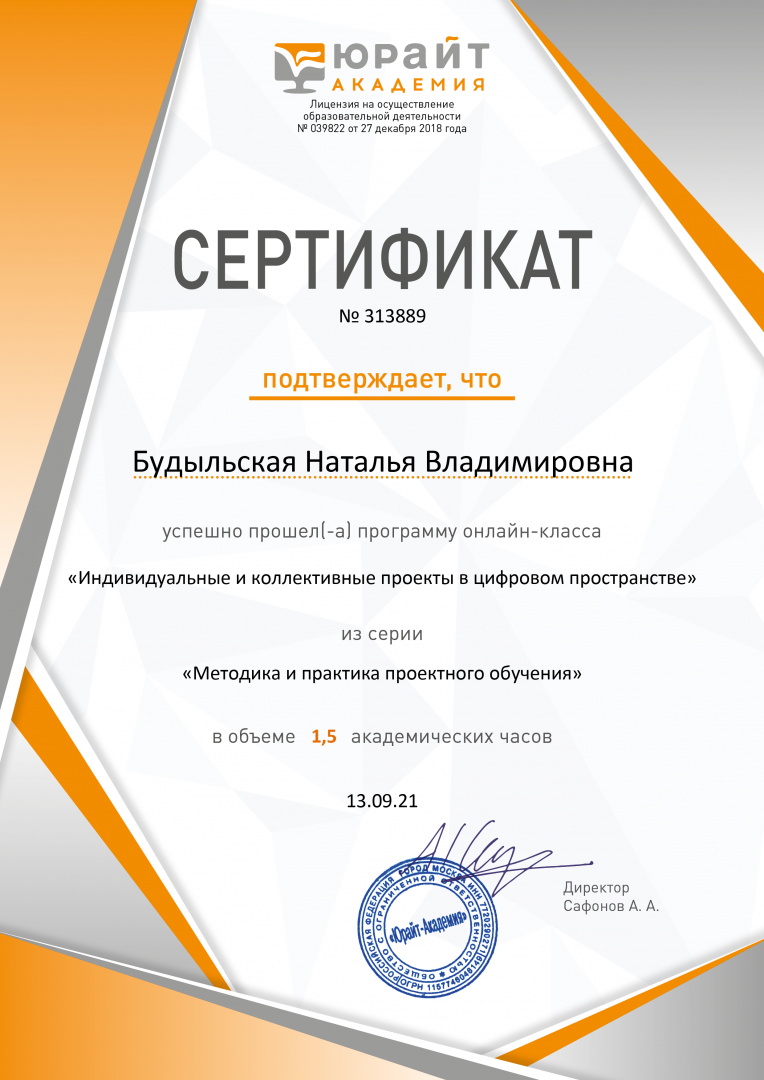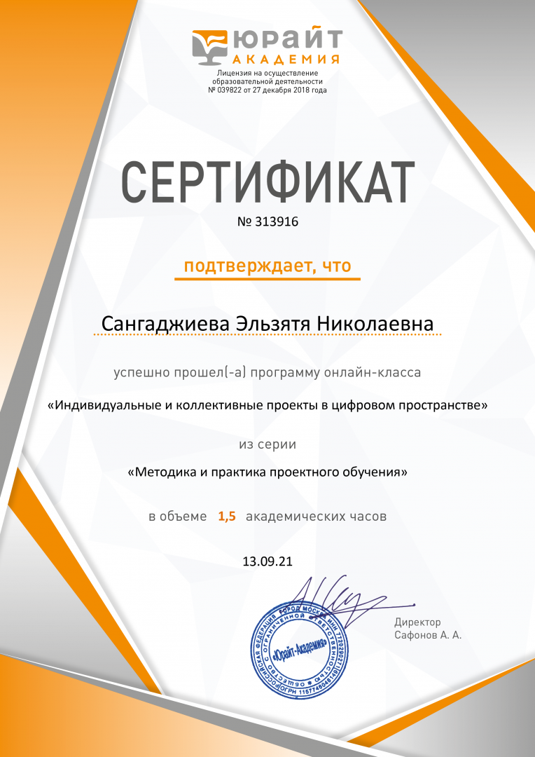 13 сентября 2021 года преподаватели юридических дисциплин Басангова Г.В., Басанова Д.В., Будыльская Н.В., Сангаджиева Э.Н. приняли участие в вебинаре по теме «Индивидуальные и коллективные проекты в цифровом пространстве». Применение метода проектов является одним из требований современных ФГОС. Во время вебинара рассмотрены особенности реализации проектов в цифровой среде, а также индивидуальных и коллективных проектов в онлайн-пространстве, предоставлены материалы для работы.