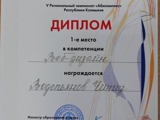 1 место — Водопьянов Ч. (компетенция «Веб-дизайн», руководитель Вепрева О.Н.)