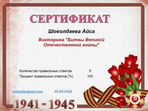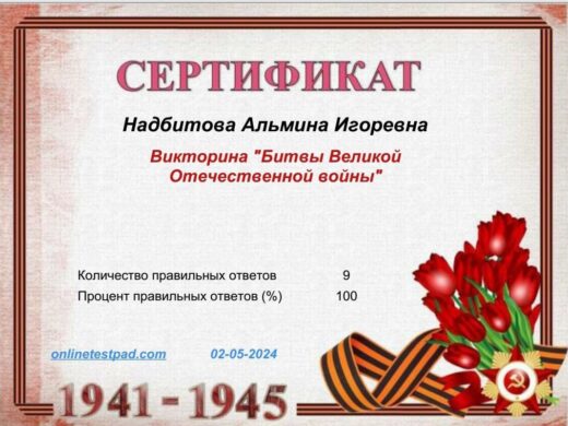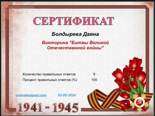 В целях воспитания гражданской позиции, чувства гордости за историческое прошлое своей Родины 03 мая 2024 года студенты специальности «Право и организация социального обеспечения» прияли участие в онлайн-викторине «Битвы Великой Отечественной войны». Вопросы викторины включали в себя знания о боевых сражениях периода Великой Отечественной войны, о городах-героях, об орденах и медалях.