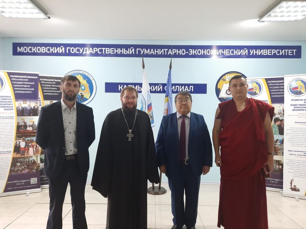 22 сентября 2021 года в КФ МГГЭУ состоялась встреча студентов первого года обучения с представителями религиозных конфессий. Открыл встречу директор филиала, доктор экономических наук Э.Л. Пашнанов, обратившись к первокурсникам с теплыми поздравлениями и напутствиями в новом учебном году. Во время встречи приглашенные гости — священнослужитель Центрального хурула Калмыкии «Золотая обитель Будды Шакьямуни» Йонтен-гелюнг, протоиерей Алексей Грищенко, заместитель председателя Духовного управления мусульман Республики Калмыкия Гаджиев Рабадан Гаджиевич — затронули вопросы нравственности, уважительного отношения к старшему поколению, преподавателям, смысла жизни и важности получения знаний. В завершение встречи молодые люди получили ответы на интересующие их вопросы.