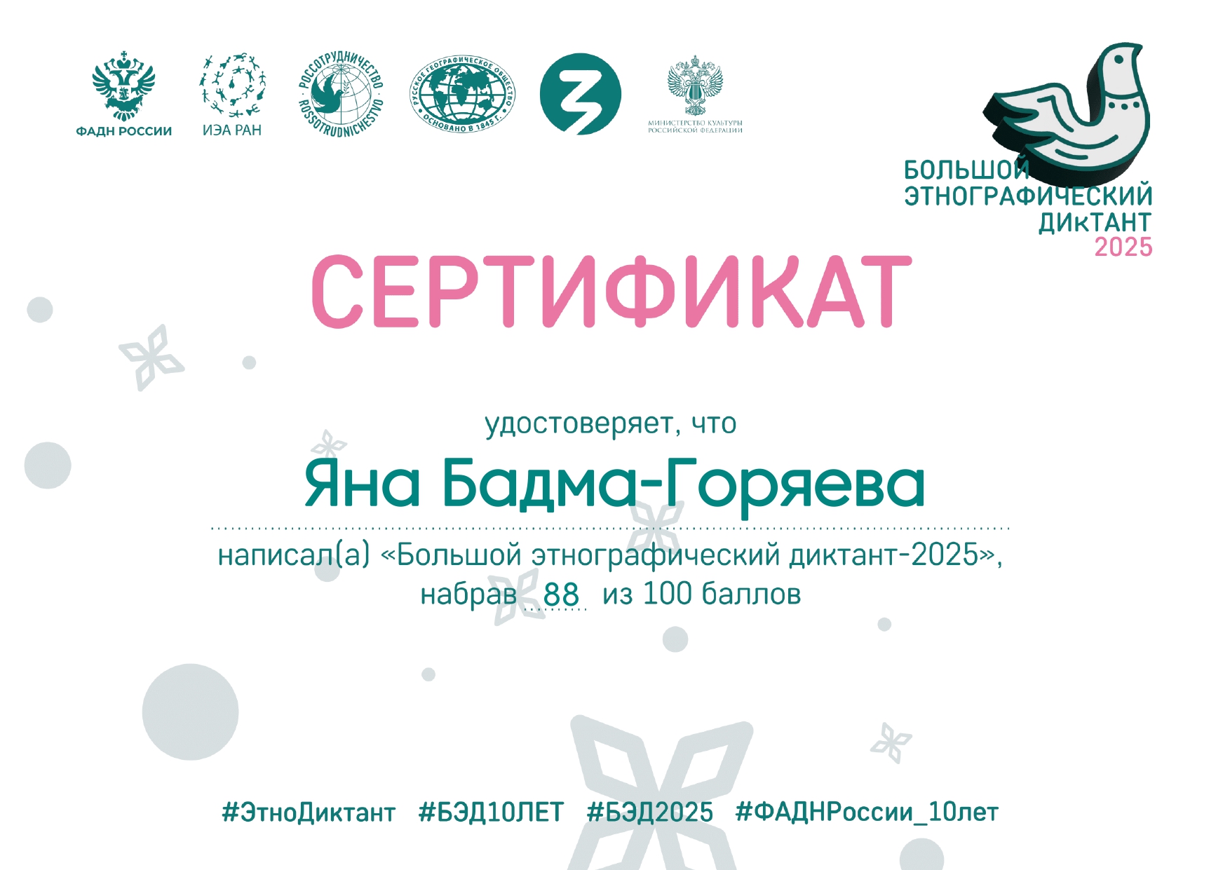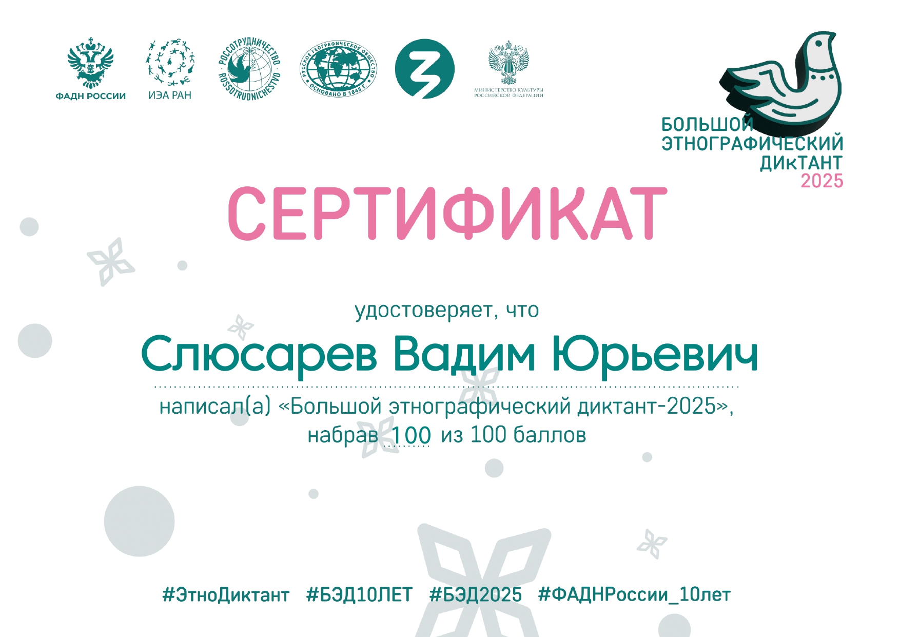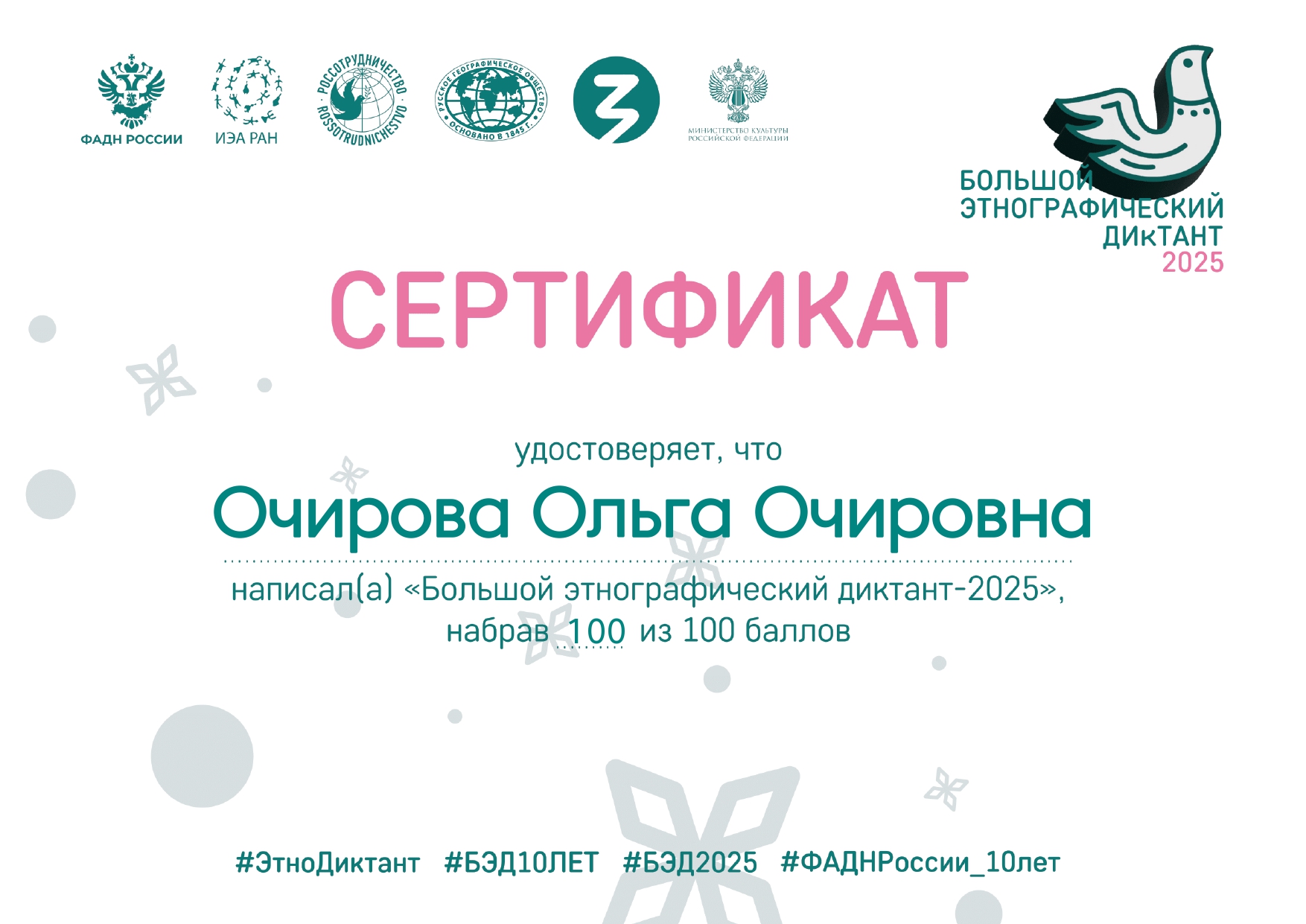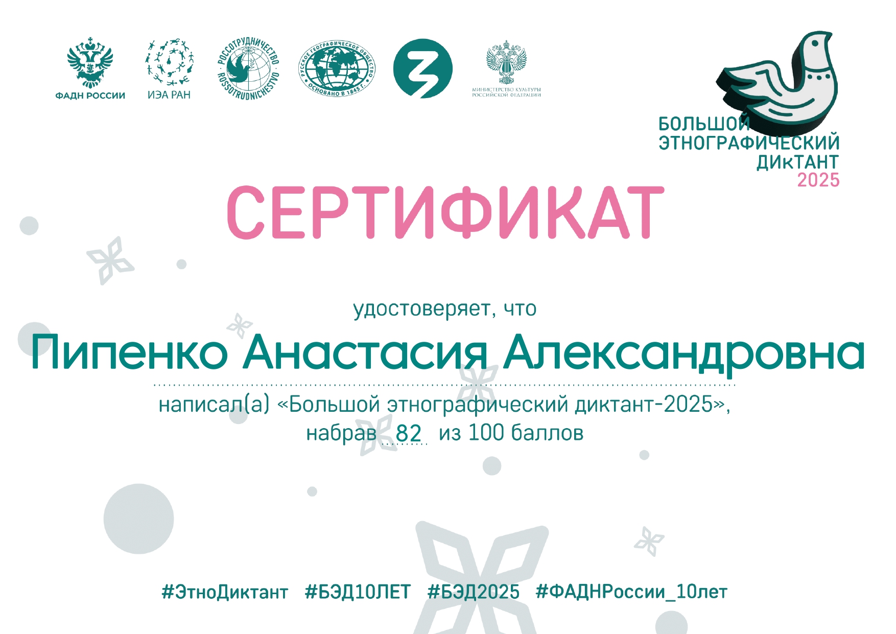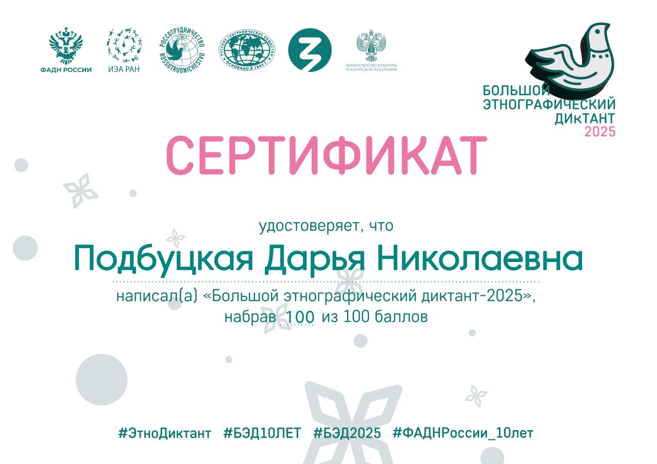 С 01 по 08 ноября 2025 года студенты КФ РГУ СоцТех специальности Экономика и бухгалтерский учет (по отраслям) приняли участие в международной акции «Большой этнографический диктант». Цель просветительной акции — оценить уровень этнографической грамотности обучающихся, их знаний о народах, проживающих на территории Российской Федерации, и привлечь внимание к необходимости формирования эффективных инструментов для поддержания межнационального мира и согласия в стране. По завершении прохождения диктанта каждому участнику выдан электронный сертификат.