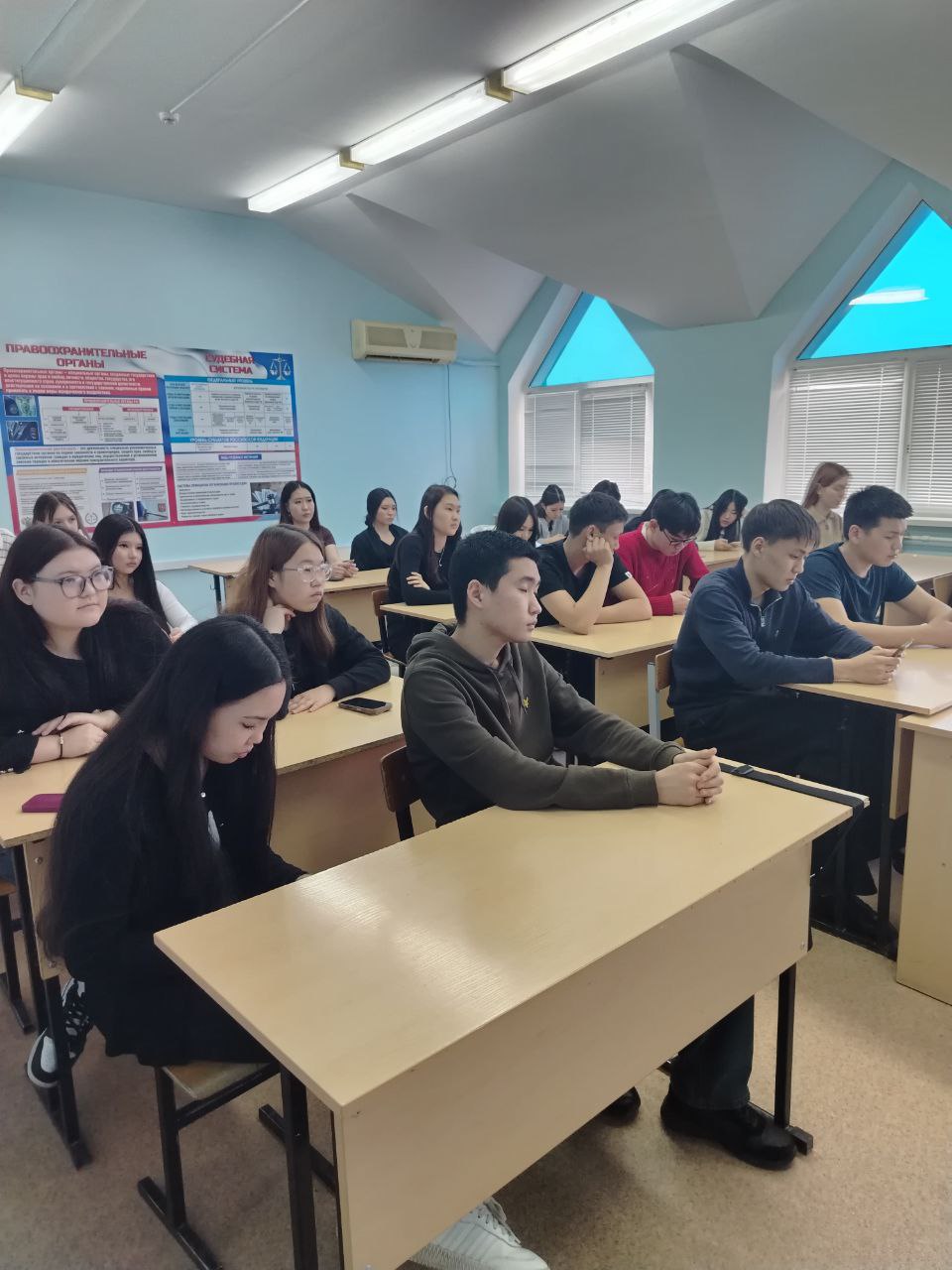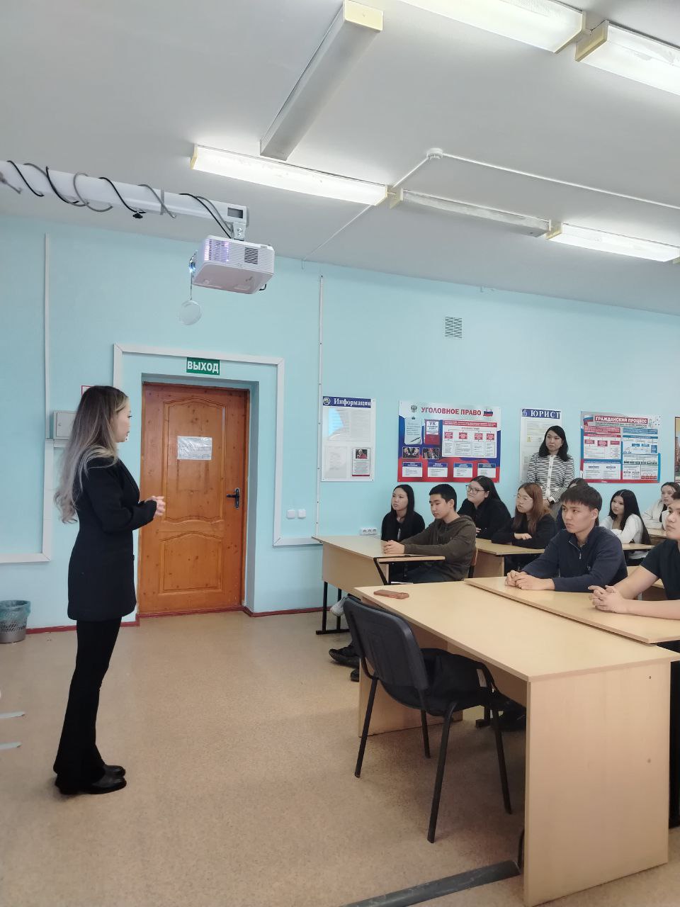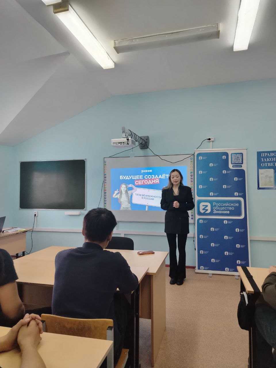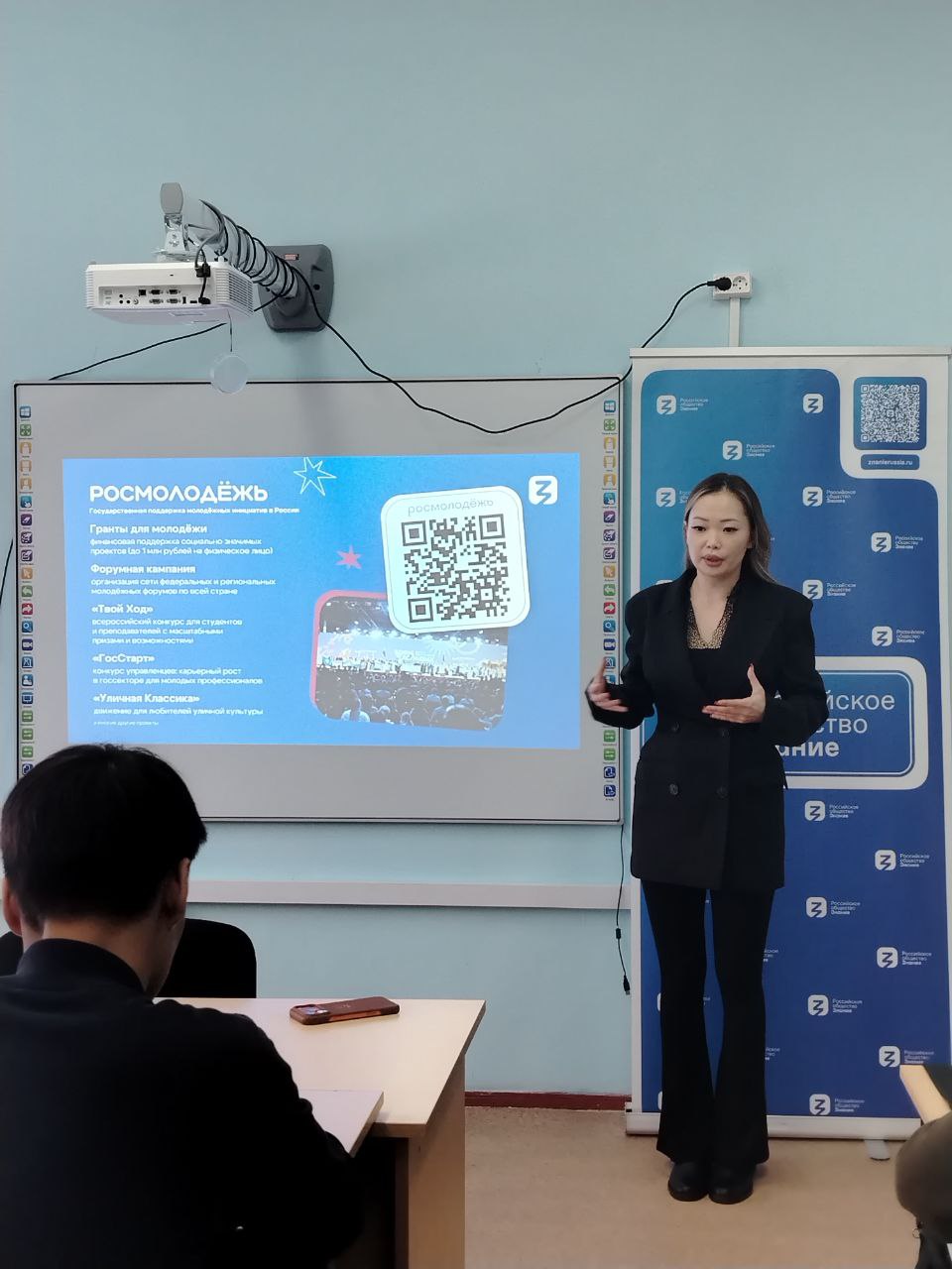 В целях вовлечения молодежи в социально значимую деятельность 20 февраля 2026 года представителем Калмыцкого РО ВОО «Молодая Гвардия Единой России» и лектором Российского общества «Знание» Донкаевой Ангирой Саналовной для студентов специальности «Юриспруденция» проведена лекция «Будущее создается в России», направленная на то, чтобы вдохновить молодых людей на активное участие в формировании своего будущего путем участия в различных фестивалях, проектах и конкурсах (Росмолодежь, Фестиваль «Таврида.АРТ», Путешествуем вместе). В рамках мероприятия освещены вопросы грантовой поддержки молодежных инициатив, деятельности различных некоммерческих и молодежных организаций.