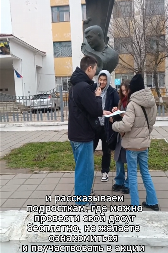 Студентами был составлен список мест, где молодежь сможет интересно и полезно провести досуг. Затем на улицах Элисты молодые люди рассказывали подросткам о доступных, развивающих, бесплатных местах и мероприятиях в городе в предновогоднее и новогоднее время, где они могут провести свободное время с удовольствием и пользой, ответили на вопросы и раздали листовки с подробным описанием мероприятий.