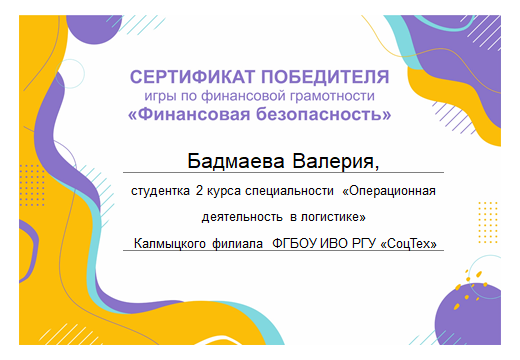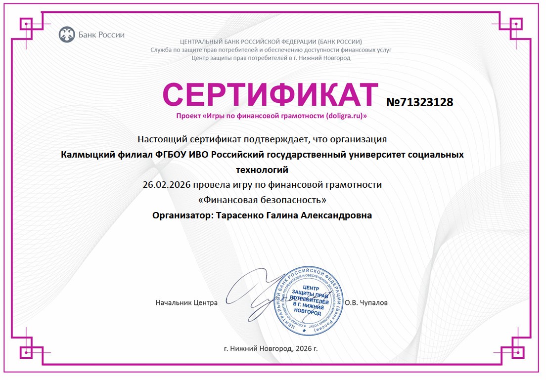 26 февраля 2026 года в рамках реализации онлайн-проектов «Игры по финансовой грамотности», организатором которых выступает Центральный банк Российской Федерации, студенты 2 курса специальности 38.02.03 Операционная деятельность в логистике под руководством преподавателя Тарасенко Г.А. приняли участие в деловой игре «Финансовая безопасность».