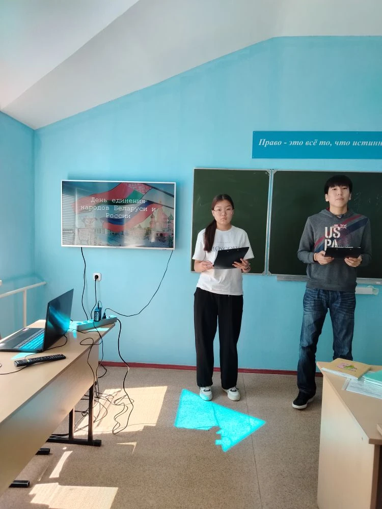 02 апреля 2026 года в гр. Ю-1А и Ю-1Б специальности «Юриспруденция» (кл.рук. Басанова Д.В., Будыльская Н.В.) состоялся Единый урок, посвященный Дню единения народов Беларуси и России. Будущие юристы узнали об истории праздника, его значении для укрепления связей между Республикой Беларусь и Российской Федерацией. Особое внимание было уделено символике двух государств – флагам, гербам, гимнам, которые отражают уникальность и общие ценности каждого народа. Молодым людям рассказали о народных обычаях и традициях, которые передаются из поколения в поколение, сохраняя культурное наследие.