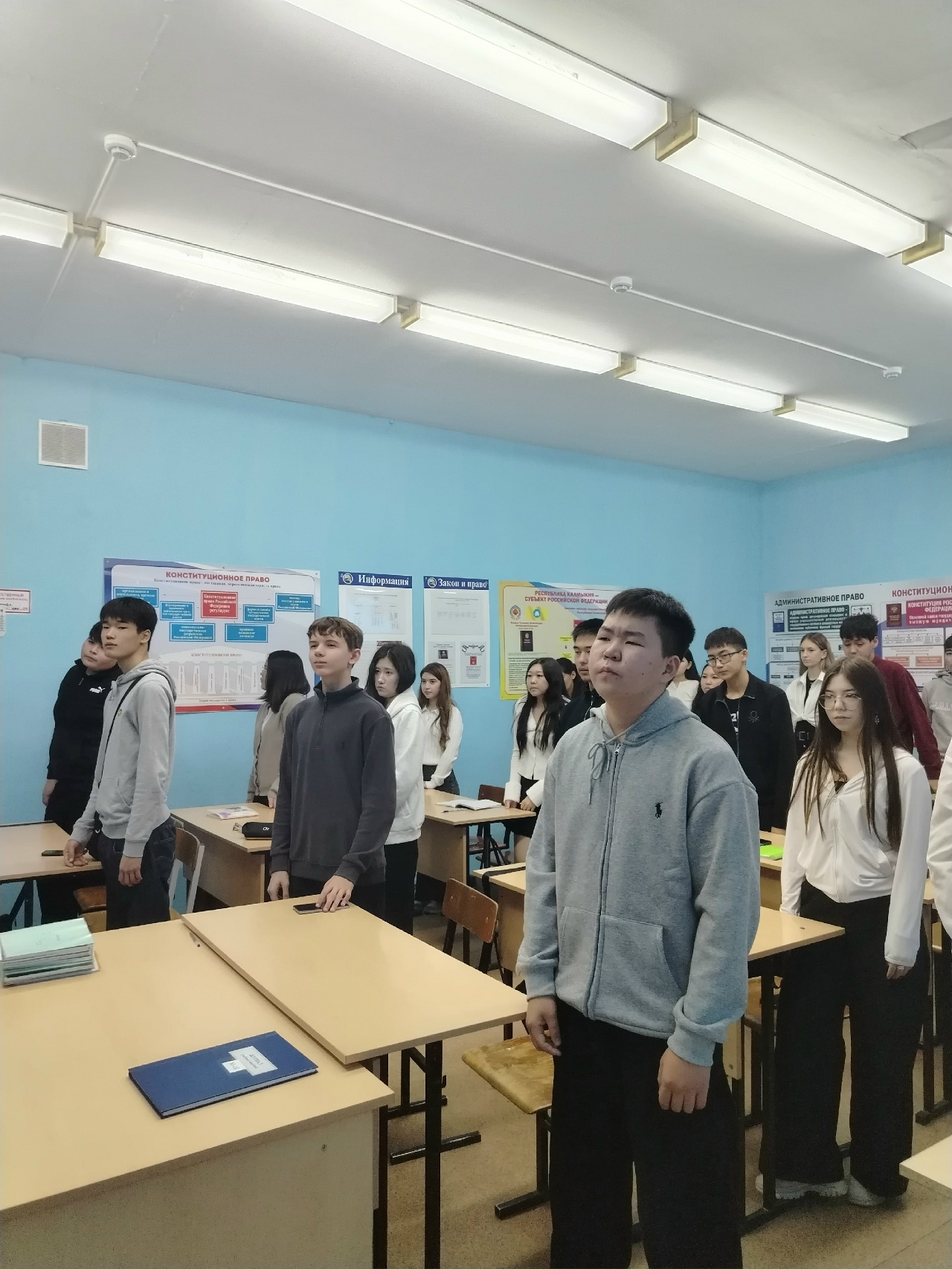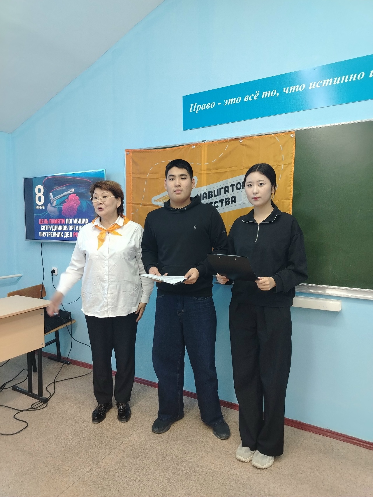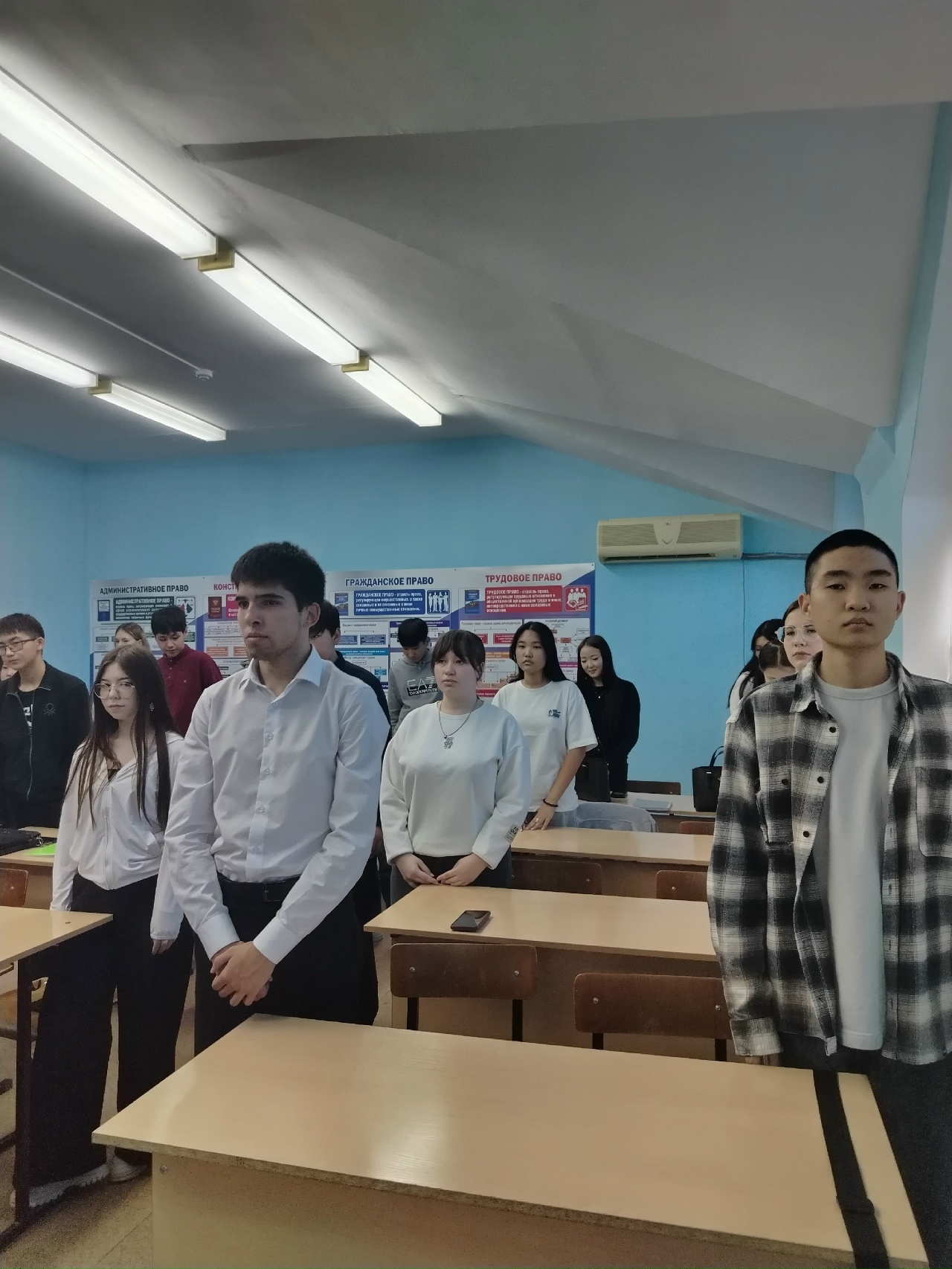 В целях воспитания гражданственности и патриотизма 07 ноября 2025 года студенты 1 курса специальности «Юриспруденция» (кл. рук. Будыльская Н.В.) организовали и провели час мужества, посвященный Дню памяти погибших при исполнении служебных обязанностей сотрудников ОВД. Молодые люди рассказали о героях правоохранительных органов — наших земляках, которые ценой собственной жизни обеспечивали безопасностьграждан Республики Калмыкия в мирное время. В завершении мероприятия прошла Минута молчания.