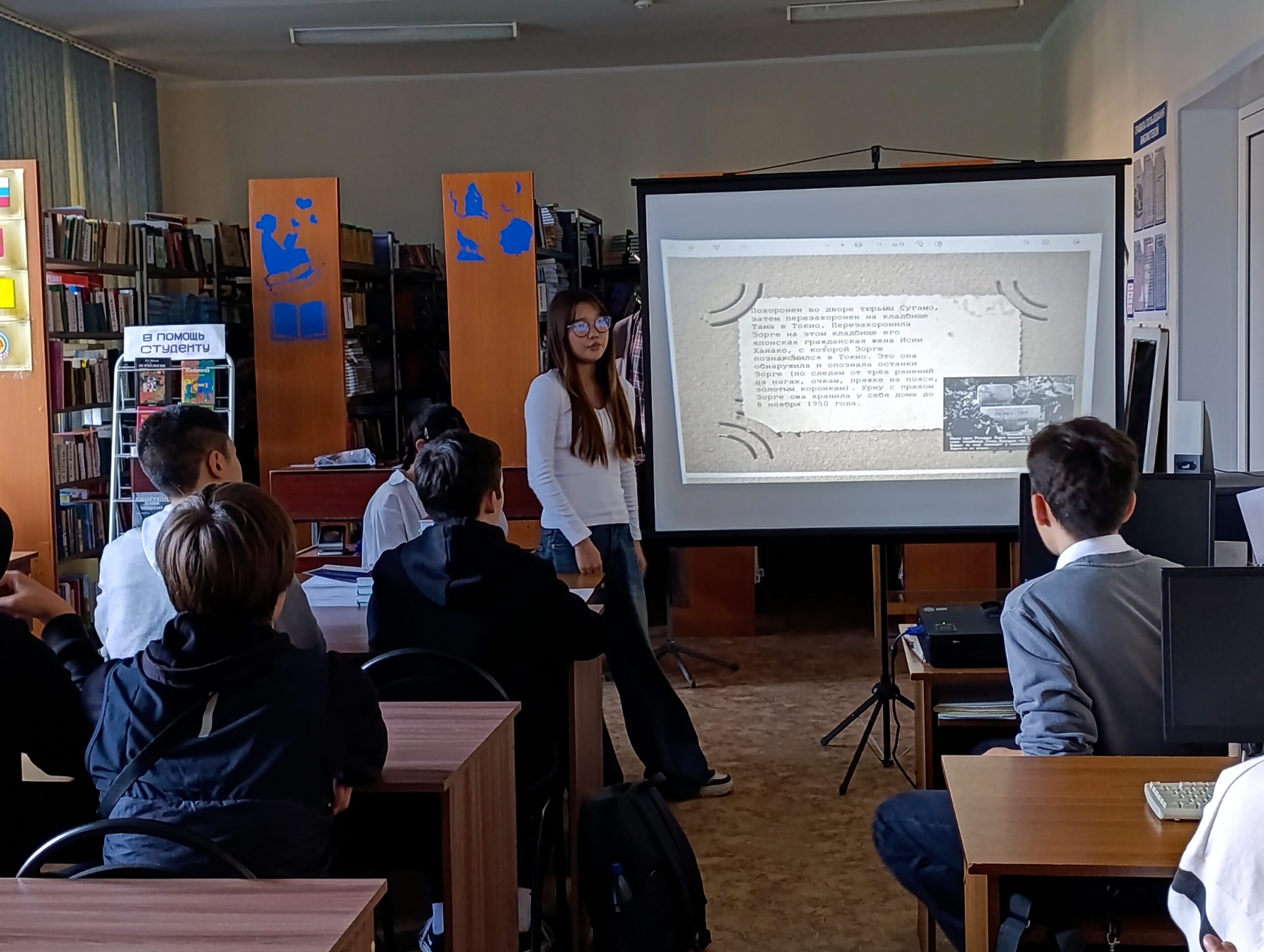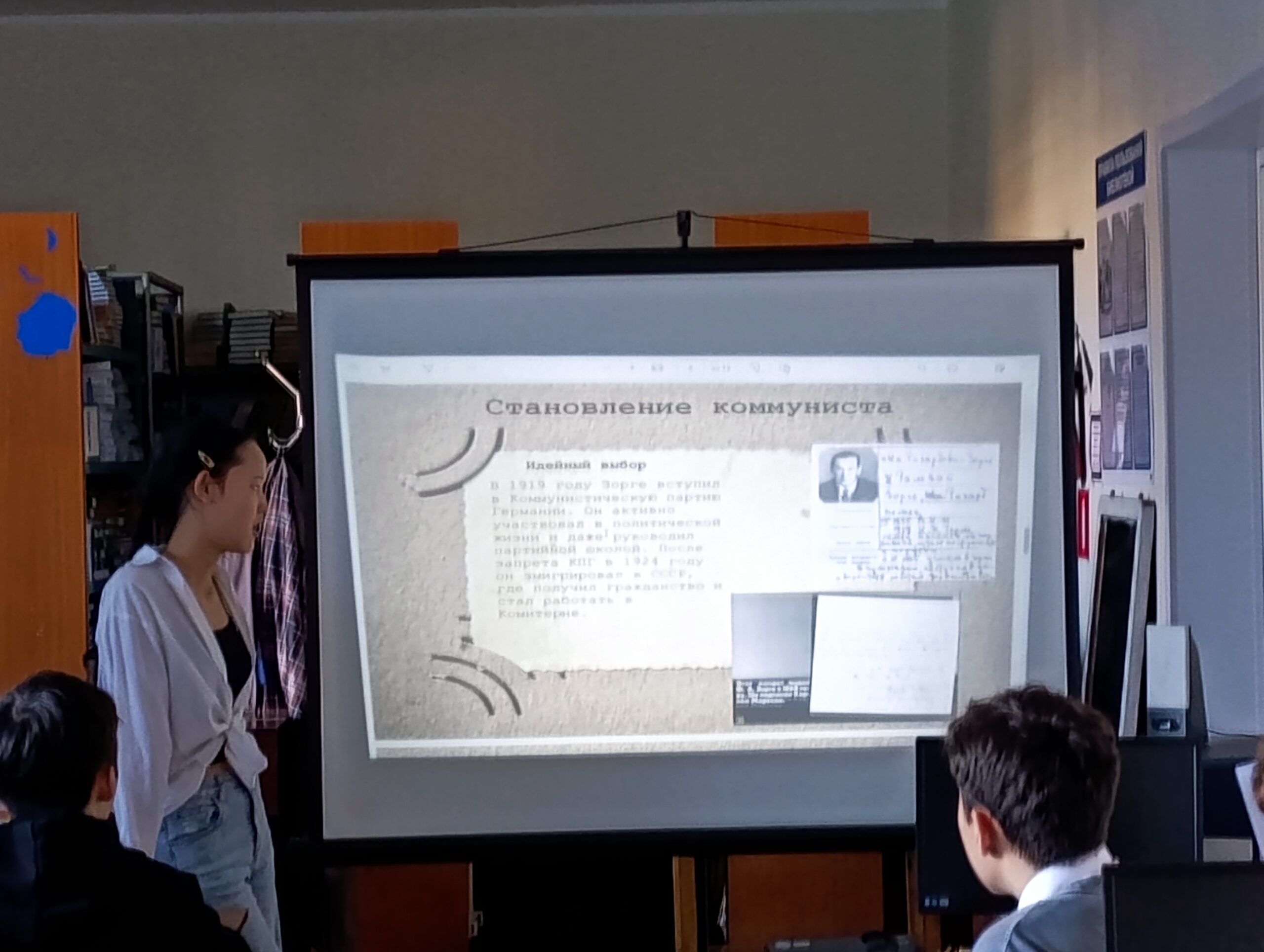 08 октября 2025 года в библиотеке КФ РГУ СоцТех состоялся библиотечный урок «Героев помним имена». Заведующий библиотекой Бевинова И.В. совместно с членами Совета библиотеки познакомили студентов с биографией советского разведчика Рихарда Зорге и показали презентацию «Я, может быть, слишком русский». В завершение урока студенты посмотрели фильм «Кто такой Рихард Зорге?».Подвиг Рихарда Зорге заключается в том, что, героически рискуя жизнью, он сумел раздобыть ряд стратегически важных сведений, позволивших в дальнейшем выиграть Великую Отечественную войну.