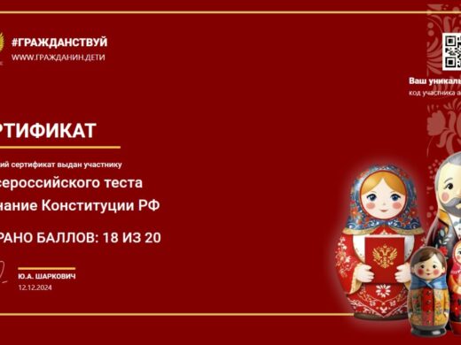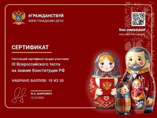 12 декабря 2024 года, в День Конституции Российской Федерации, в рамках Декады ПЦК общих гуманитарных и профессиональных дисциплин и модулей студенты, преподаватели и сотрудники КФ РГУ СоцТех приняли участие в IX Всероссийском тесте на знание Конституции Российской Федерации. Ежегодная просветительская акция организована Всероссийским общественным Движением «Гражданин» в целях повышения общей правовой грамотности относительно Основного закона страны. Тестирование со слоганом #гражданствуй традиционно основано на наиболее обсуждаемых обществом темах, соотнесенных со статьями Конституции Российской Федерации. Участники просветительской акции награждены сертификатами участников.