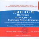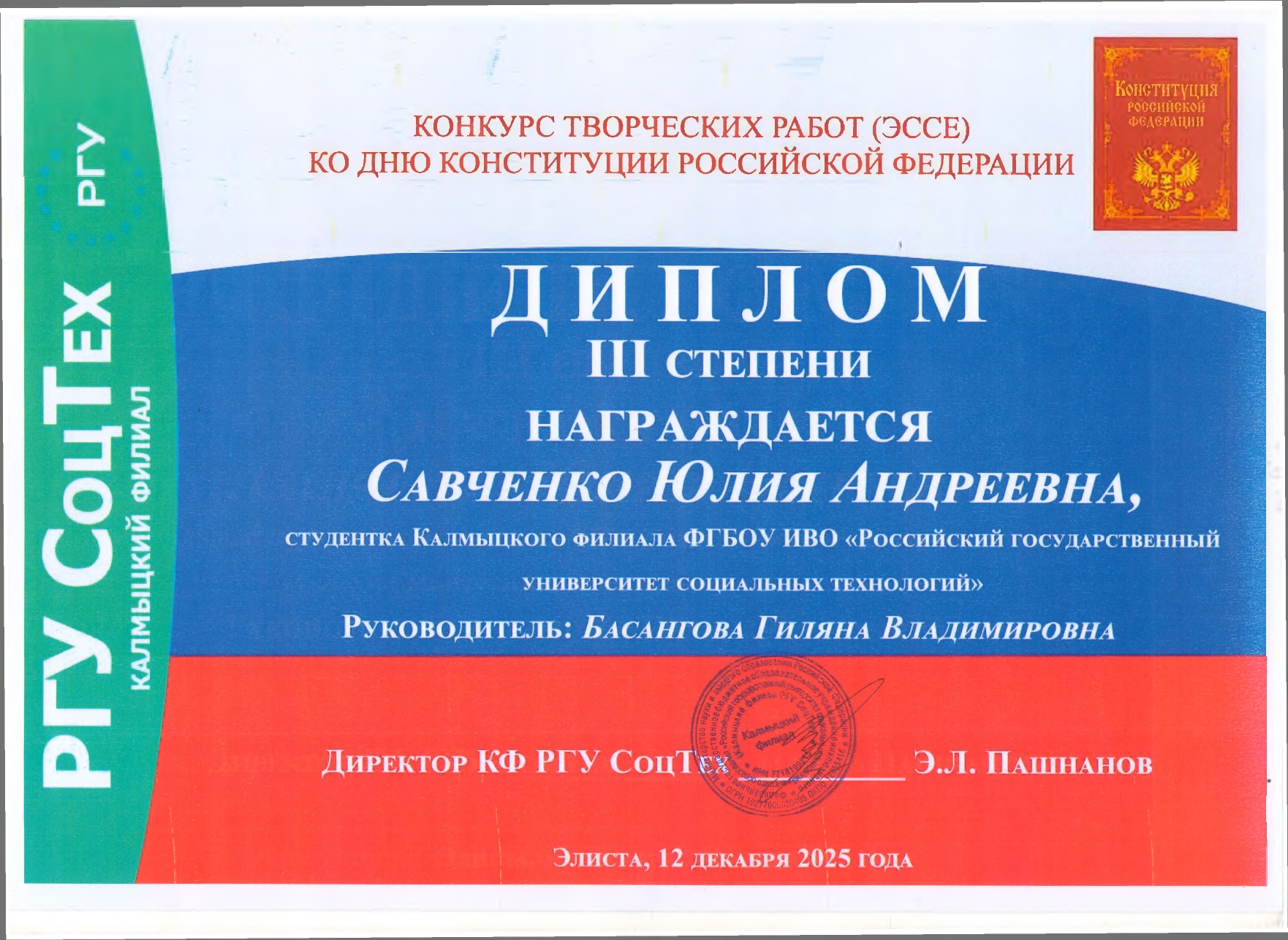 III призовое место — Савченко Юлия, Калмыцкий филиал РГУ СоцТех. Тема работы «Роль Конституции Российской Федерации в моей жизни». Руководитель: преподаватель Басангова Г.В.