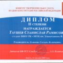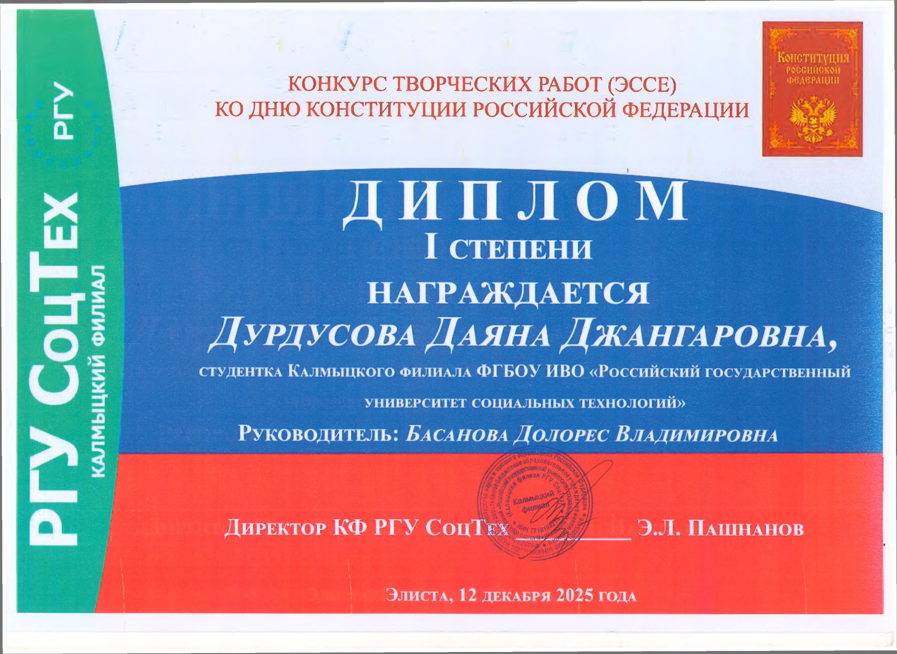 I призовое место — Дурдусова Даяна, Калмыцкий филиал РГУ СоцТех. Тема работы «Я и Конституция моей страны». Руководитель: преподаватель Басанова Д.В.