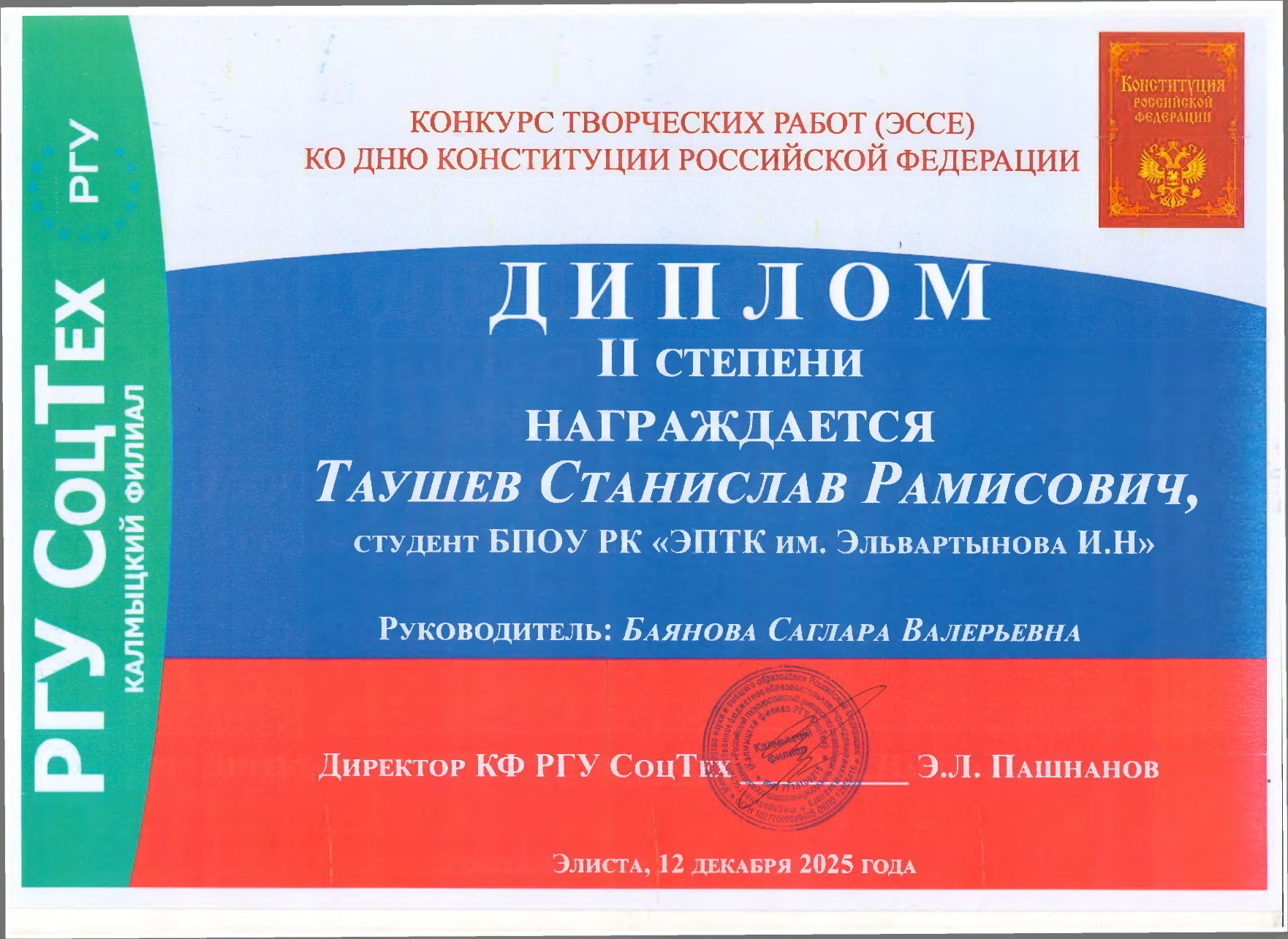 II призовое место — Таушев Станислав, БПОУ РК «Элистинский политехнический колледж им. Эльвартынова И.Н.». Тема работы «Конституция России – путь к правовому государству». Руководитель: преподаватель Баянова С.В.