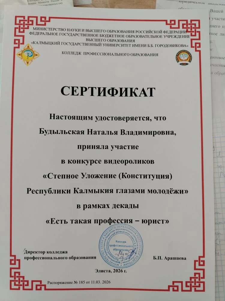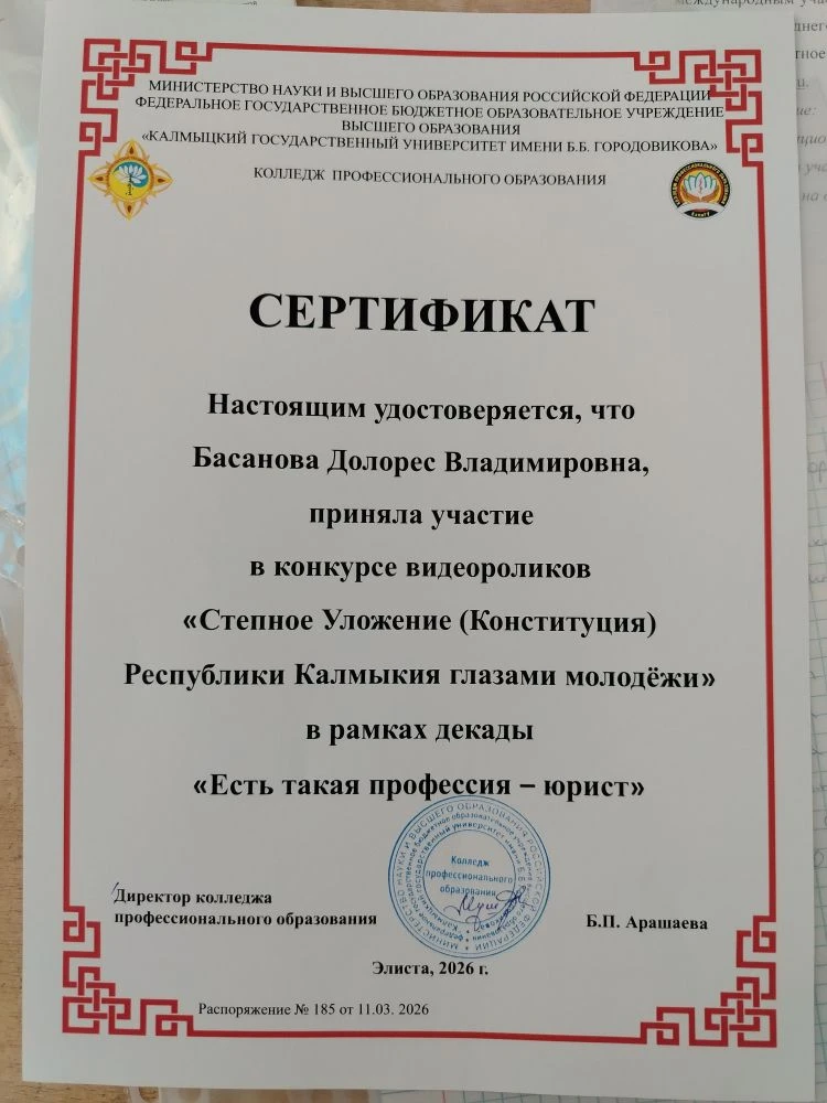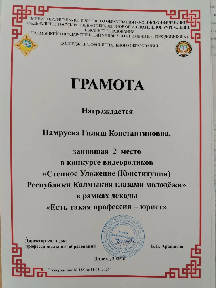 В рамках межссузовского взаимодействия 06 апреля 2026 года студентка гр. Ю-1А специальности «Юриспруденция» Намруева Гиляш (под руководством Басановой Д.В., Будыльской Н.В.) заняла 2 место в конкурсе видеороликов «Степное Уложение (Конституция) Республики Калмыкия глазами молодежи». Мероприятие прошло в рамках декады «Есть такая профессия – юрист» в колледже профессионального образования «Калмыцкого государственного университета им. Б.Б. Городовикова», ставшее отличной возможностью для обучающихся проявить творческий подход к изучению основ права, а также позволившее участникам глубже изучить основной закон Республики Калмыкия, научиться выражать свои мысли через современные медиформаты, осознавать важность правовых норм в повседневной жизни.