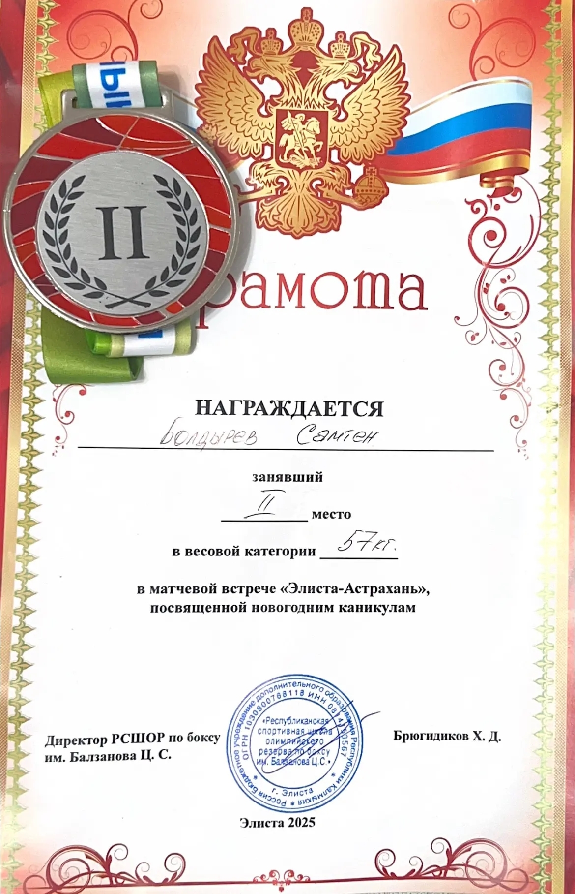 11.01.2026 Матчевые встречи по боксу 10-11 января 2026 года студент группы Ю-1А специальности «Юриспруденция» Болдырев Самтэн принял участие в новогодних матчевых встречах по боксу, проявив свои лучшие бойцовские качества и заняв II место. Поздравляем и желаем дальнейших побед!