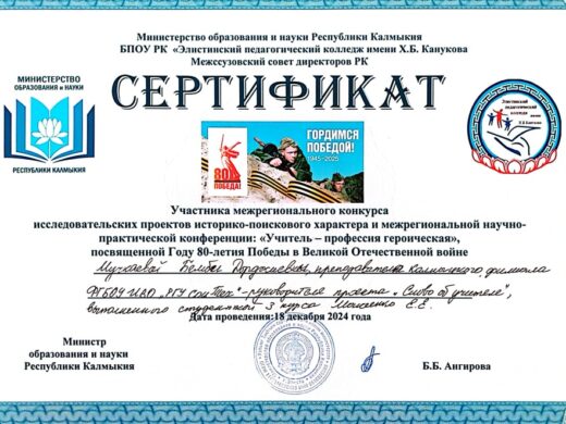 18 декабря 2024 года студентка группы Б-3Б Моисеенко Екатерина под руководством преподавателей Мучкаевой Б.Д. и Эрендженовой О.К. приняла участие в межрегиональном конкурсе исследовательских проектов историко-поискового характера и межрегиональной научно-практической конференции «Учитель — профессия героическая», посвящённой Году 80-летия Победы в Великой Отечественной войне. Студентка достойно представила Калмыцкий филиал РГУ СоцТех на престижном конкурсе, заняв III место. Жюри высоко оценили ее проект «Слово об Учителе», отметив соответствие содержания работы заявленной теме и грамотное выполнение всех требований Конкурса.