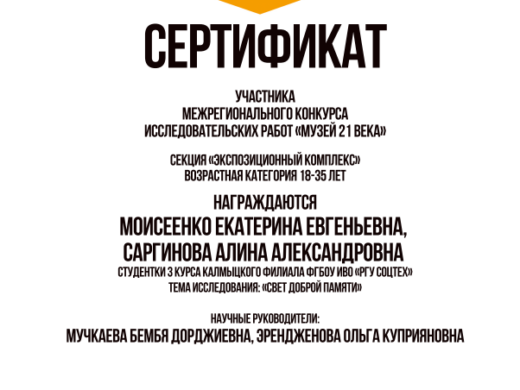 26 декабря 2024 года подведены итоги Межрегионального конкурса исследовательских работ «Музей 21 века», состоявшемся в г. Волгограде. Активисты Музея истории КФ РГУ СоцТех Моисеенко Е., Саргинова А., Манжиев Т., Чиряева Ц. под руководством преподавателей Мучкаевой Б.Д. и Эрендженовой О.К. приняли участие в секциях «Краеведческая» и «Экспозиционный комплекс». Работы студентов отмечены сертификатами.