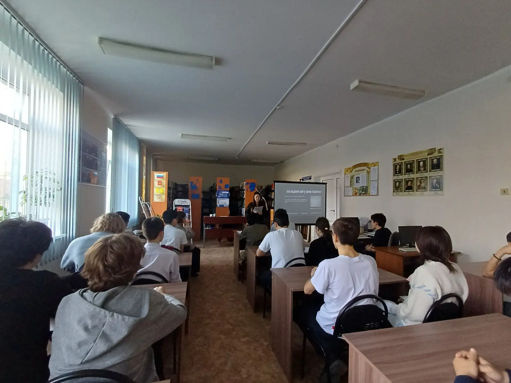 Нещерет Т., студентка 2 курса специальности 09.02.07 Информационные системы и программирование, экскурсовод Музея истории КФ РГУ СоцТех, присутствовавшая на классном часе, познакомила первокурсников с темой своего исследования, рассказала о встрече со студентами Дубовского педколледжа, на которой она представила свою работу «Наш земляк — защитник Дома Павлова». Студенты прочитали стихи о защитниках Сталинграда.