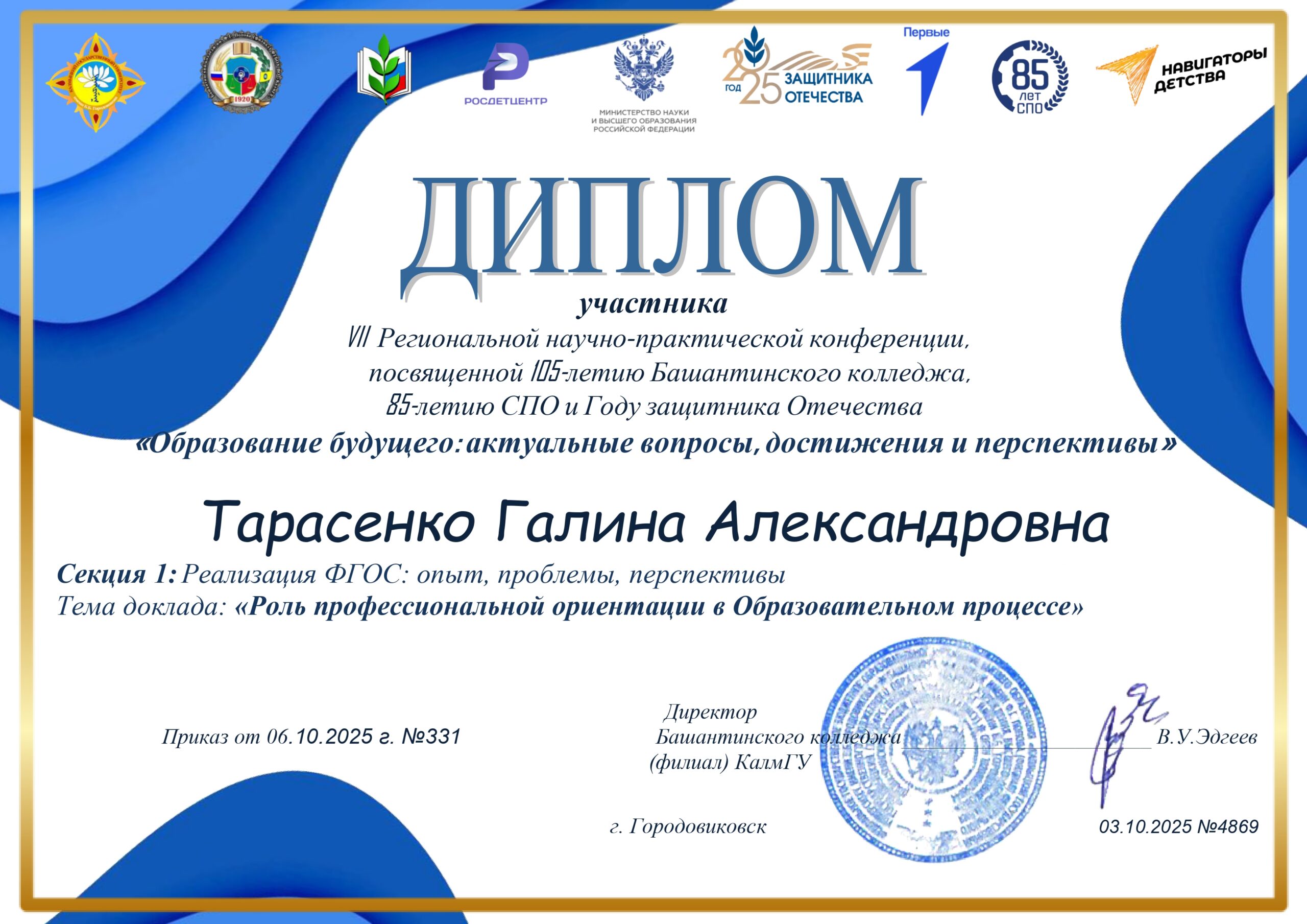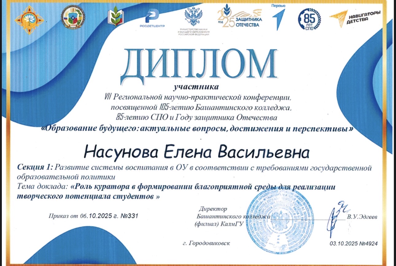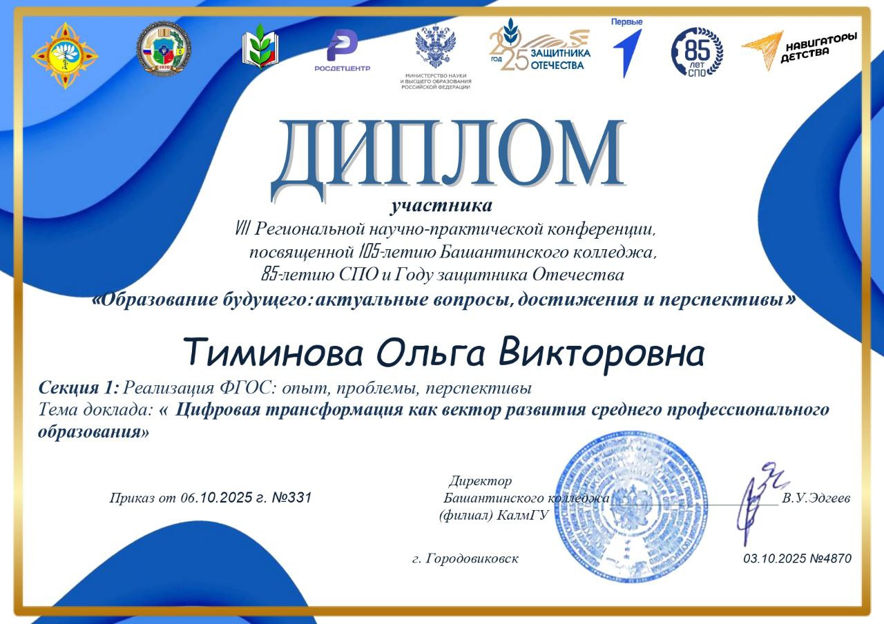 03 октября 2025 года преподаватели КФ РГУ СоцТех приняли заочное участие в VII Межрегиональной научно-практической конференции «Образование будущего: актуальные вопросы, достижения и перспективы», посвященной 105-летию Башантинского колледжа (филиала) КалмГУ, 85-летию СПО и Году защитника Отечества. Участники обсудили накопленный опыт реализации новых требований ФГОС, обозначив при этом возникшие трудности и проблемные зоны; рассмотрели современные подходы к формированию личностных качеств обучающихся, развитию лидерских способностей и укреплению патриотического сознания молодежи. По итогам мероприятия участники приняли общую резолюцию, содержащую важные рекомендации и выводы, направленные на дальнейшее развитие образовательных процессов и повышение качества подготовки кадров.