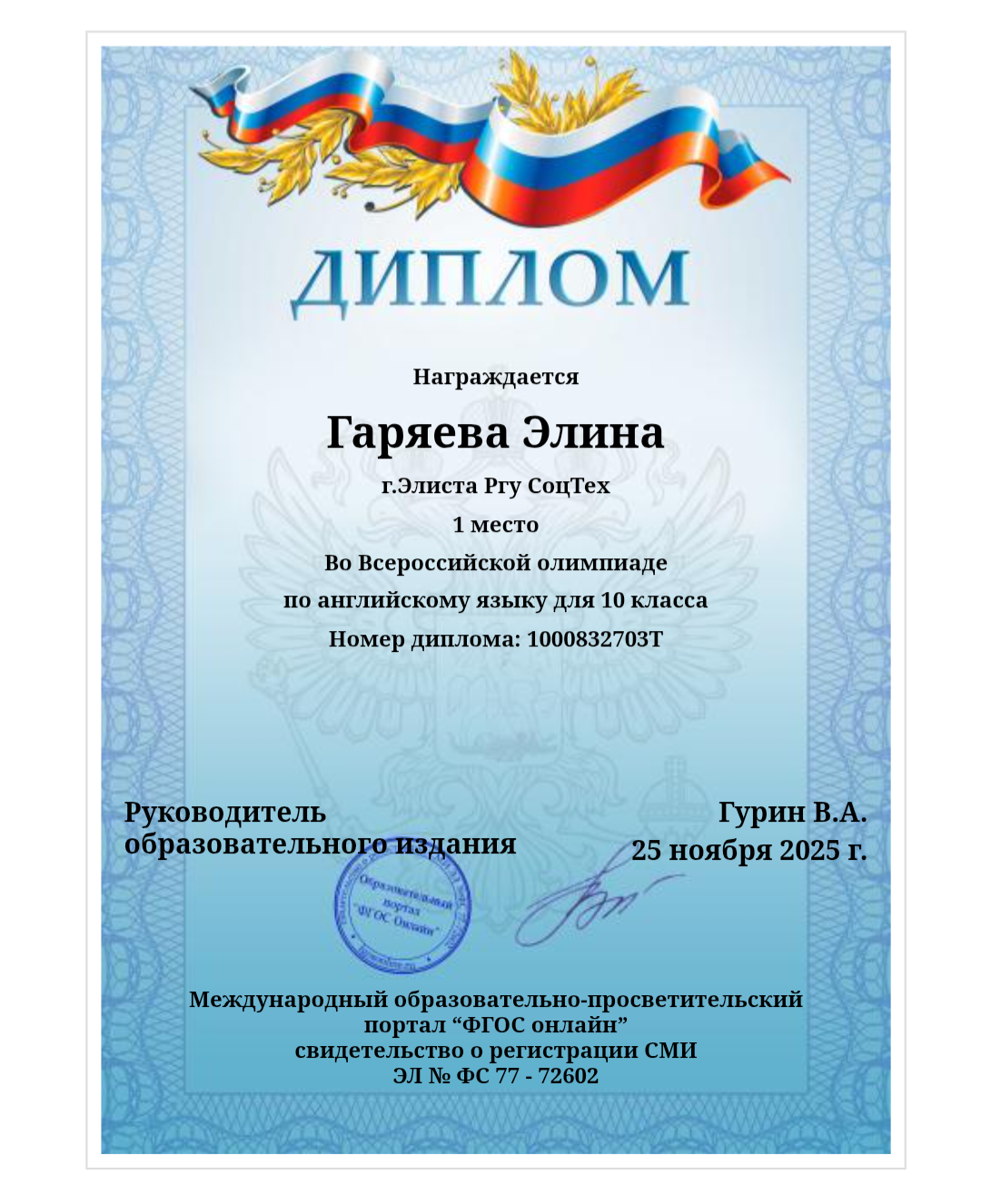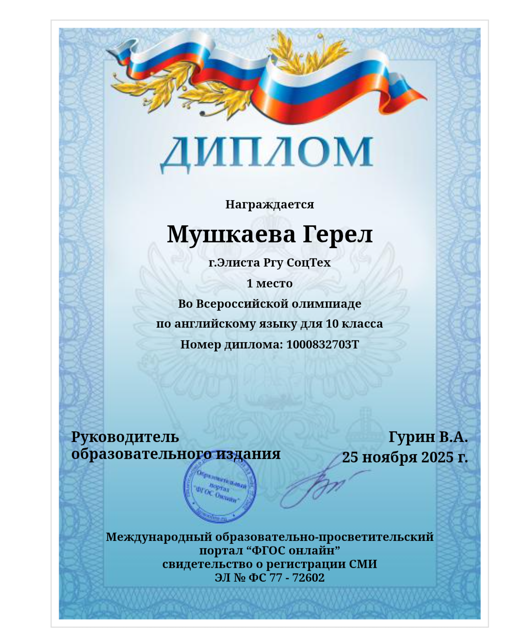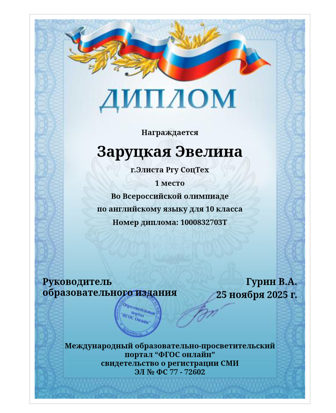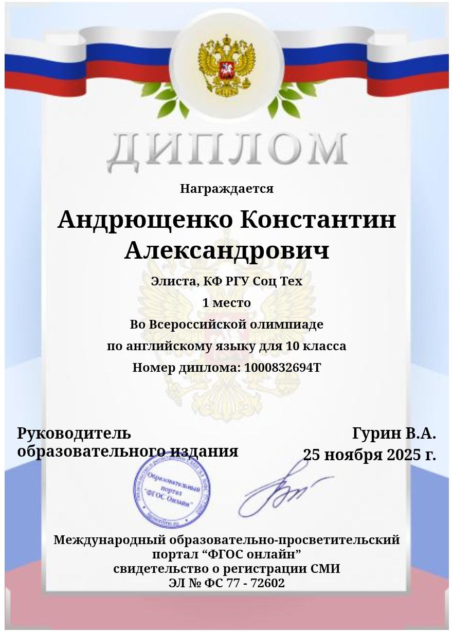 В конце ноября 2025 года студенты первого курса КФ РГУ СоцТех приняли активное участие в Международных интернет-олимпиадах по английскому языку образовательных порталов «Солнечный свет», «Дом Знания», «ФГОС онлайн» (преподаватель О.К. Эрендженова). Цель олимпиады – проверка и закрепление знаний по английскому языку. Студенты успешно выполнили предложенные задания, заняв призовые места.