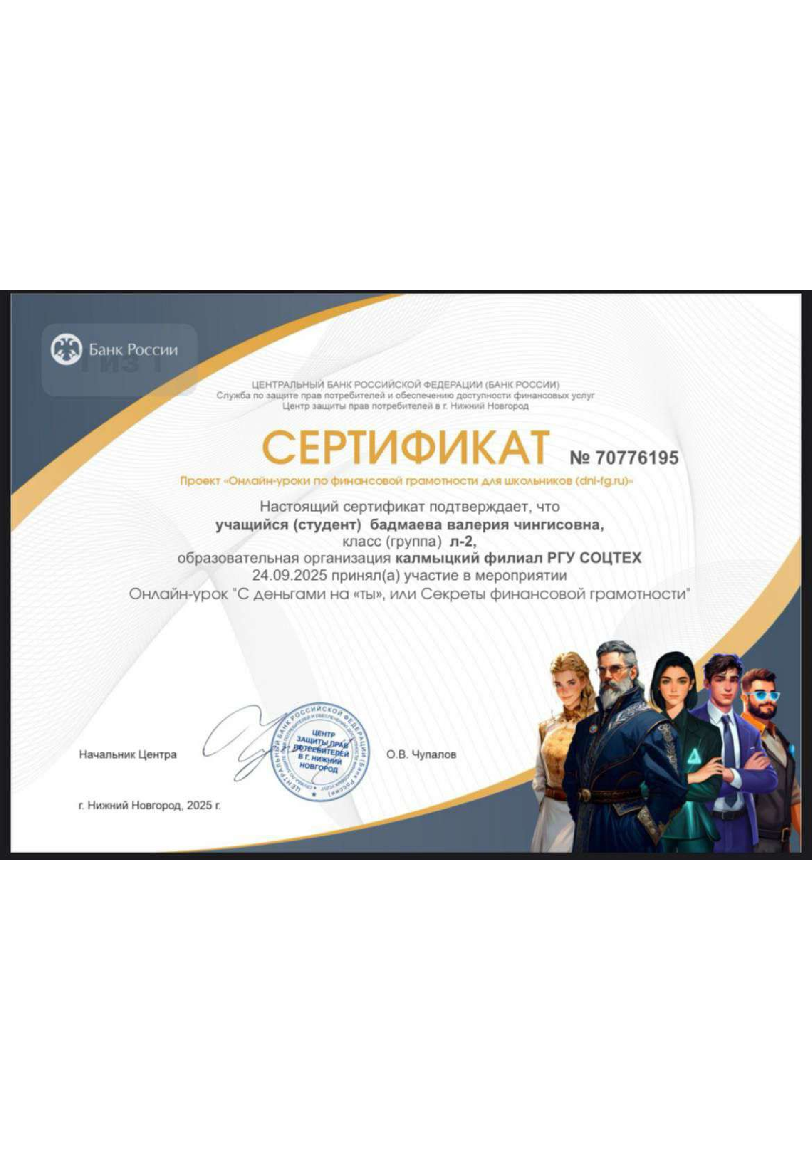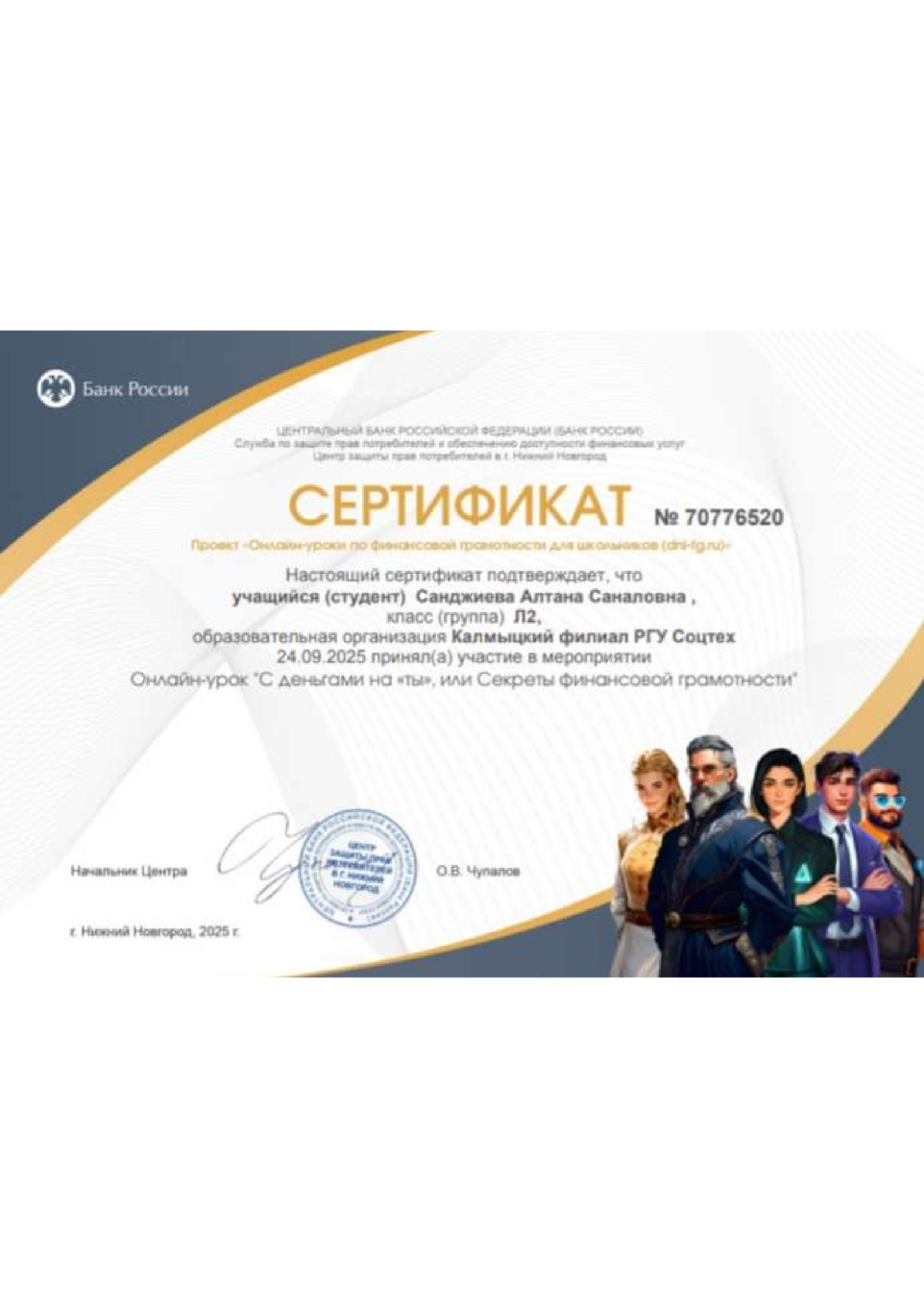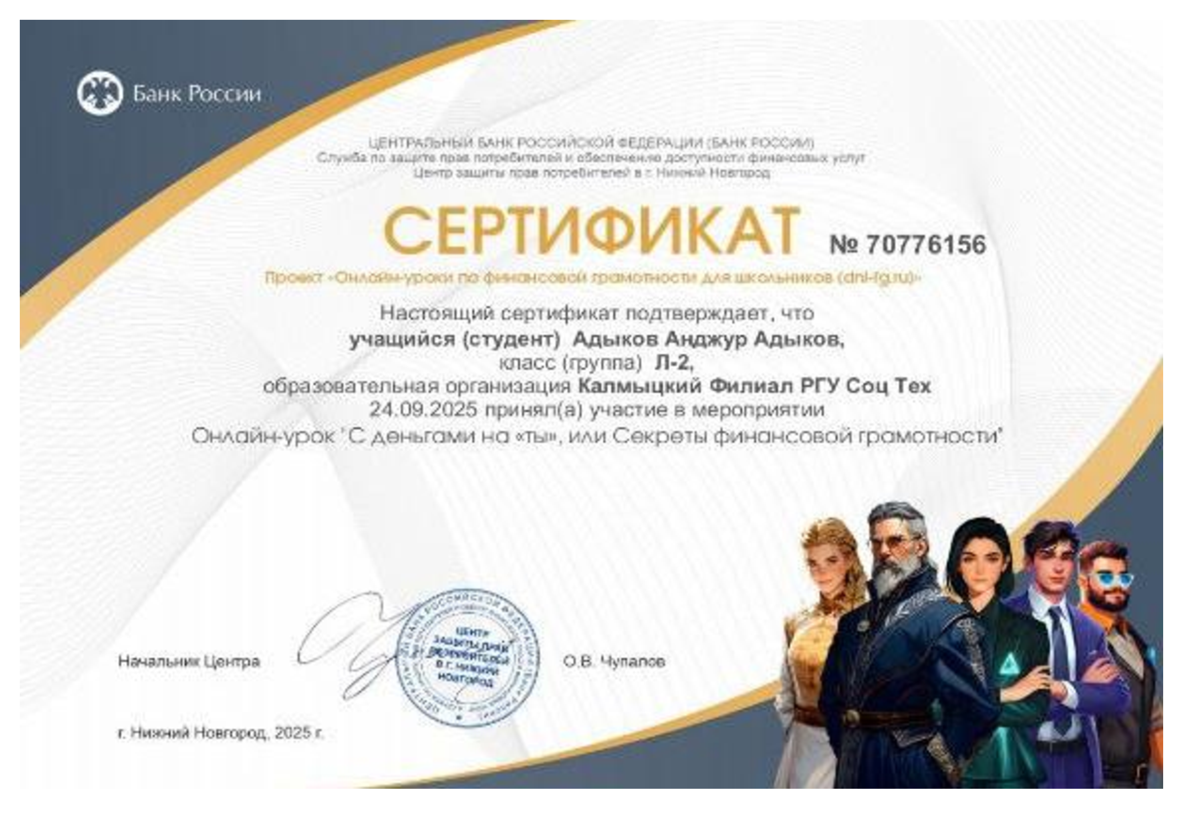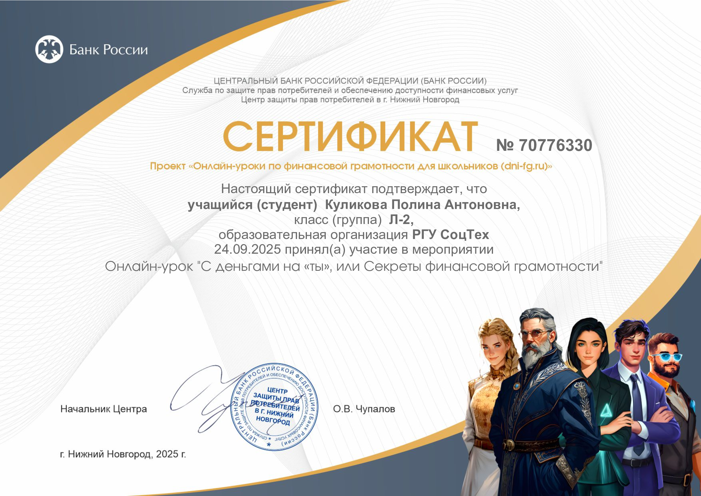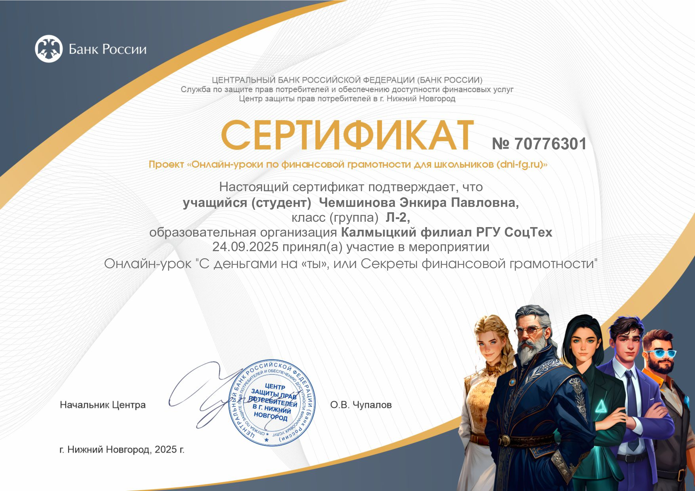 24 сентября 2025 года в рамках реализации осенней сессии онлайн-проектов по повышению финансовой грамотности, организатором которой выступает Центральный банк Российской Федерации,  студенты специальности Операционная деятельность в логистике под руководством преподавателя Тарасенко Г.А. приняли участие в онлайн-уроке «С деньгами на «ты», или секреты финансовой грамотности». Участие в данном мероприятии вызвало у студентов живой интерес к финансовым знаниям за счет нестандартной формы проведения занятия и возможности коммуникации с профессионалами в сфере экономики и финансов, позволило углубить имеющиеся знания в сфере финансовой  грамотности и безопасности. По окончании онлайн-урока всем слушателям были выданы сертификаты участников данного мероприятия.
