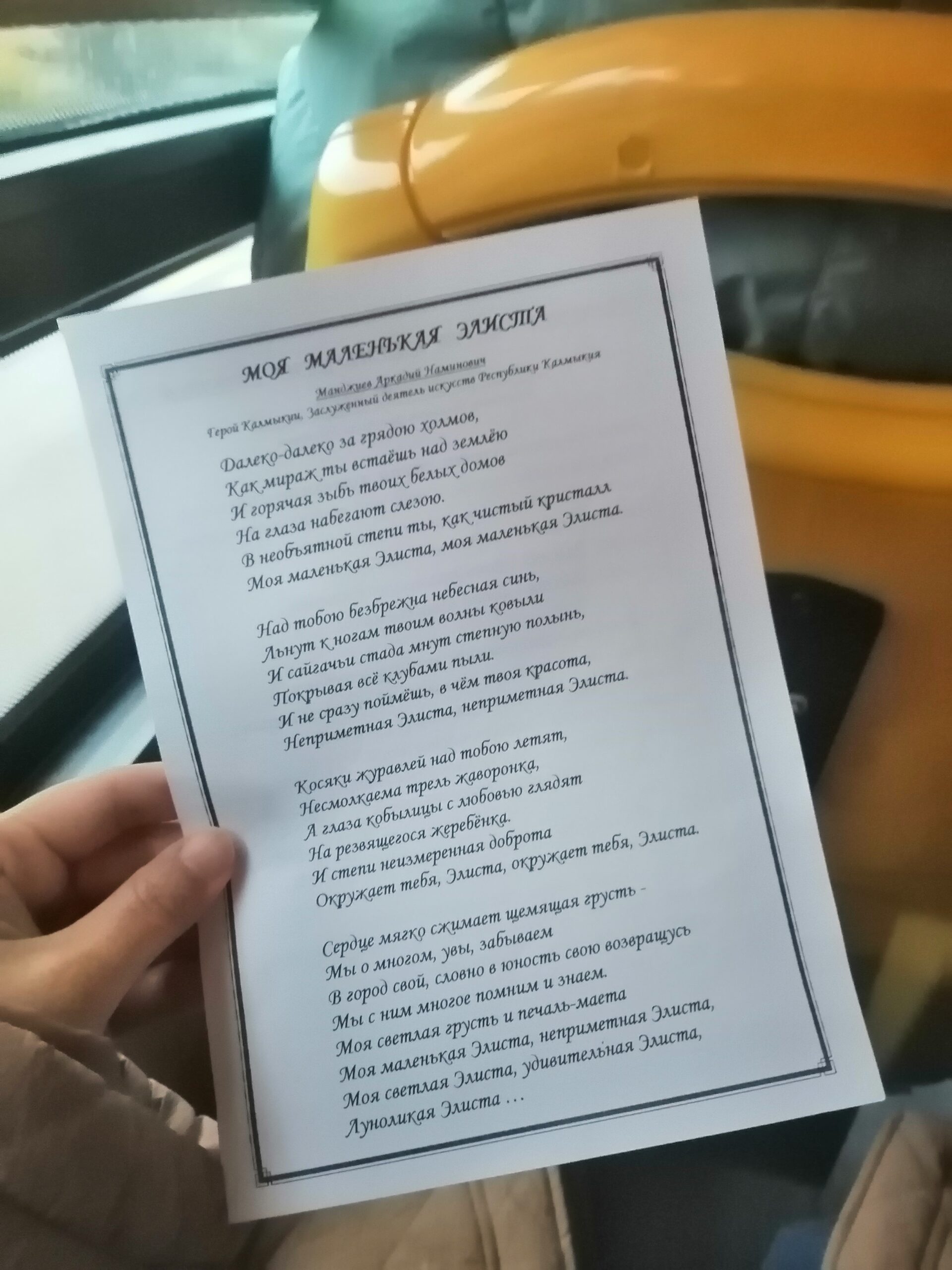 В завершении поездки участники экскурсии насладились пейзажем города под аккомпанемент музыкальных произведений Аркадия Манджиева «Моя маленькая Элиста» и Данары Шалхановой «Элиста — дочь калмыцких степей». Эти композиции, отражающие культурное и духовное наследие региона, создали атмосферу торжественности и уважения к историческим и культурным традициям.