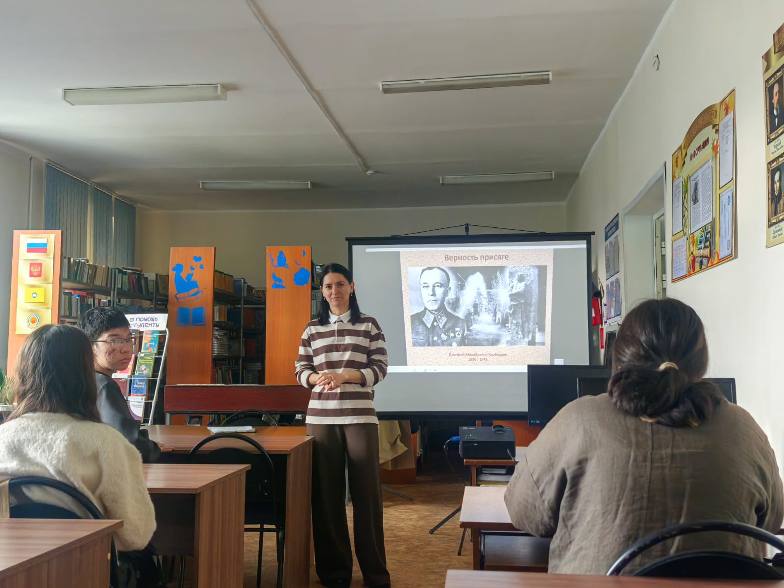 13 октября 2025 года в библиотеке КФ РГУ СоцТех состоялся патриотический час «Верность присяге», посвящённый Герою Советского Союза Дмитрию Михайловичу Карбышеву. Заведующий библиотекой Бевинова И.В. и сотрудник Национальной библиотеки имени А. Амур-Санана Мирзоева М.М. показали студентам презентацию «История одного подвига». В завершение урока студенты посмотрели документальный фильм «Генерал Карбышев». Подвиг Карбышева стал символом несгибаемой воли и преданности Родине. Его последние слова «Думайте о Родине, и мужество не покинет вас!» стали девизом для многих поколений защитников Отечества.