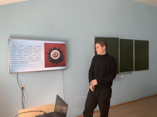 26 апреля 2022 года, в преддверии праздника 9 Мая — День Победы, студенты специальности Право и организация социального обеспечения (классный руководитель Басанова Д.В.) провели классный час, посвященный празднованию 77 годовщины Великой Победы. Молодые люди прослушали рассказ Куцаева А. о семейной реликвии — Ордене Отечественной войны II степени, которым награжден его прадедушка Куцаев Николай Иванович, защищавший наше Отечество от фашизма, просмотрели презентацию и фрагменты документальных кадров времен Великой Отечественной войны, прочитали трогательные стихи и послушали песню «День Победы», почтив светлую память погибших минутой молчания.