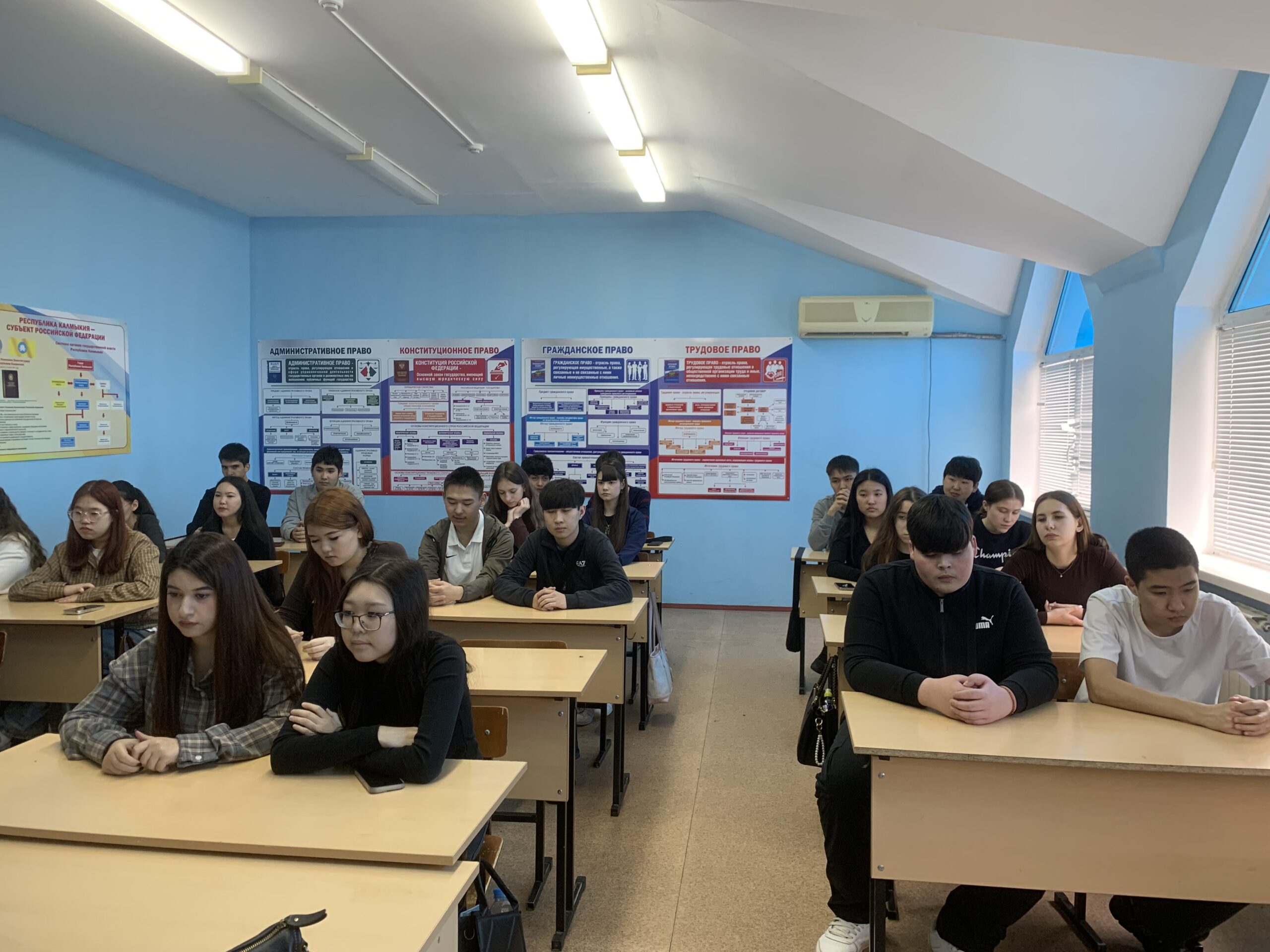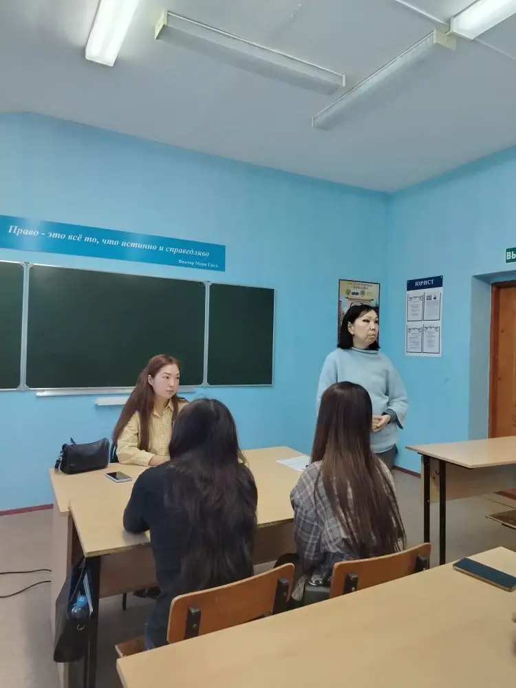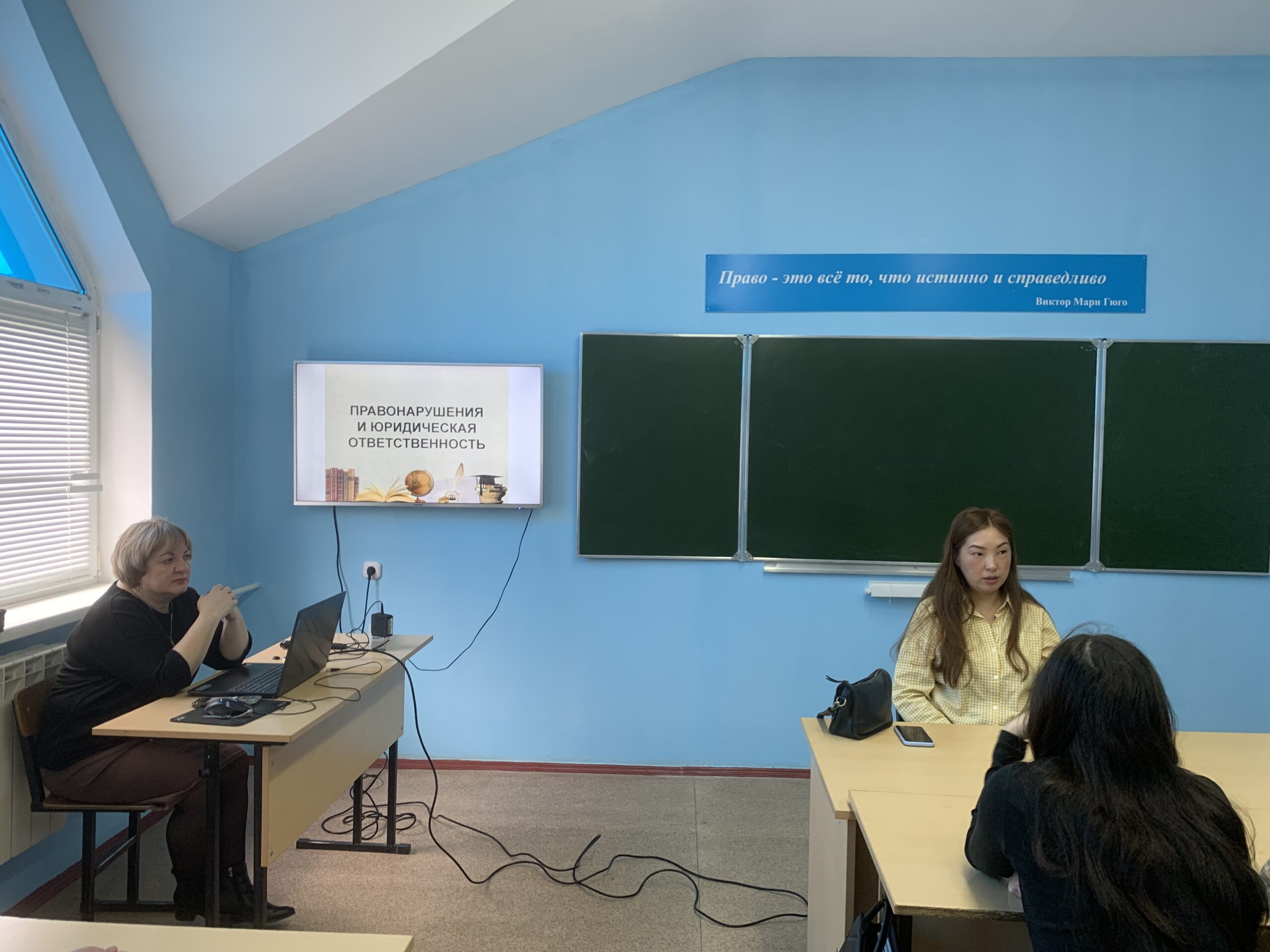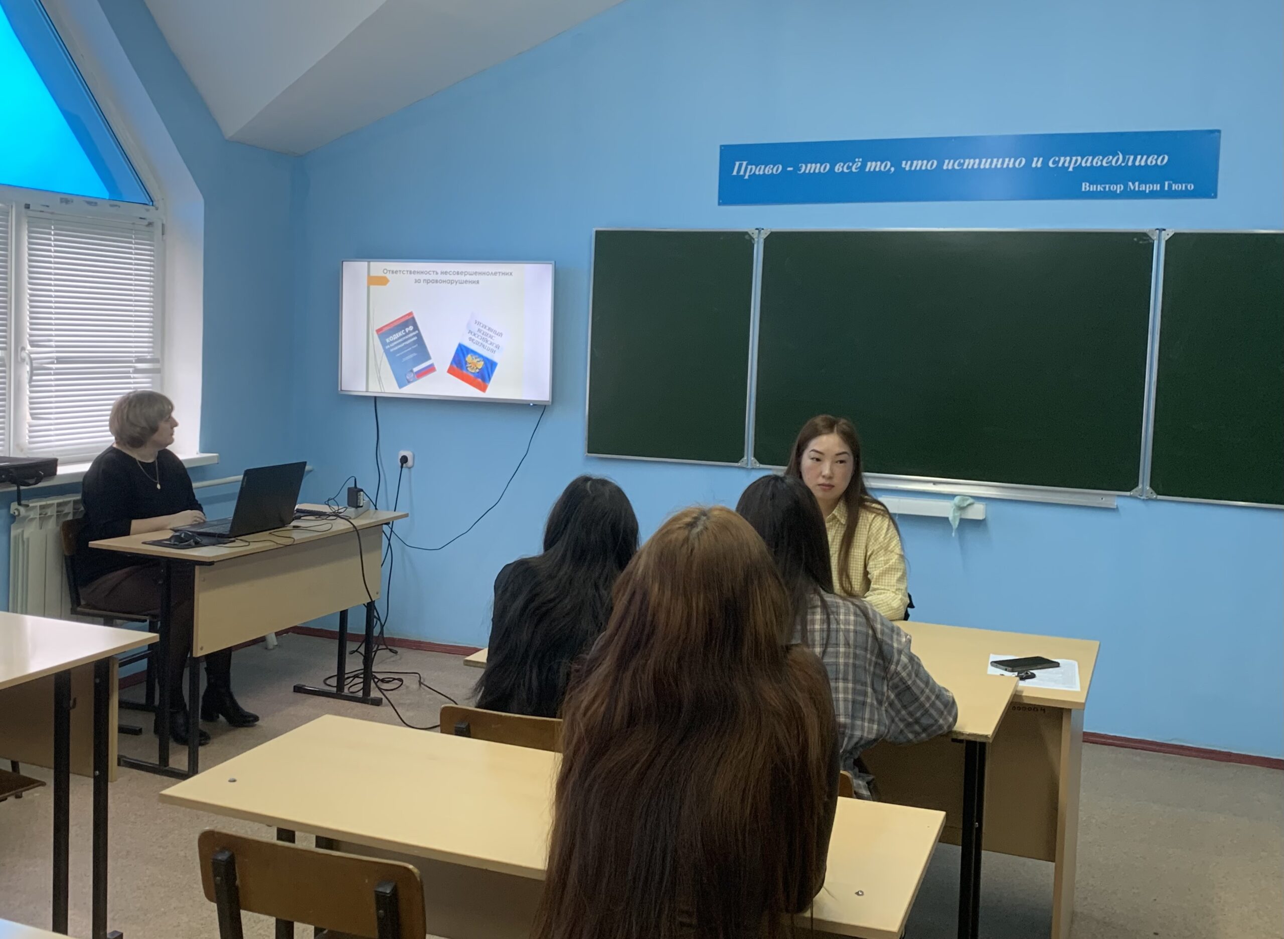 В целях формирования правовой культуры и профилактики правонарушений 30 марта 2026 со студентами гр. Ю-1А и Ю-1Б специальности «Юриспруденция» (кл. рук. Басанова Д.В., Будыльская Н.В.) организована и проведена встреча с и.о. начальника отдела по обеспечению деятельности комиссии по делам несовершеннолетних и защите их прав Администрации города Элисты Параевой К.В. на тему «Правонарушения и юридическая ответственность несовершеннолетних». В своей беседе Кермен Валерьевна акцентировала внимание обучающихся на ответственности за совершение таких правонарушений и преступлений, как вождение транспорта несовершеннолетними, несоблюдение режима комендантского часа, употребление спиртных напитков, кража, грабеж, вымогательство, хулиганство и др., объяснила, чем опасны пагубные привычки — курение табака, электронных сигарет, курительных смесей, психотропных и токсичных веществ, настоятельно рекомендовала соблюдать правила общения в социальных сетях, поведения на улице, в общественных местах и местах массового отдыха. Молодые люди с большим вниманием выслушали Кермен Валерьевну и получили ответы на все интересующие их вопросы.