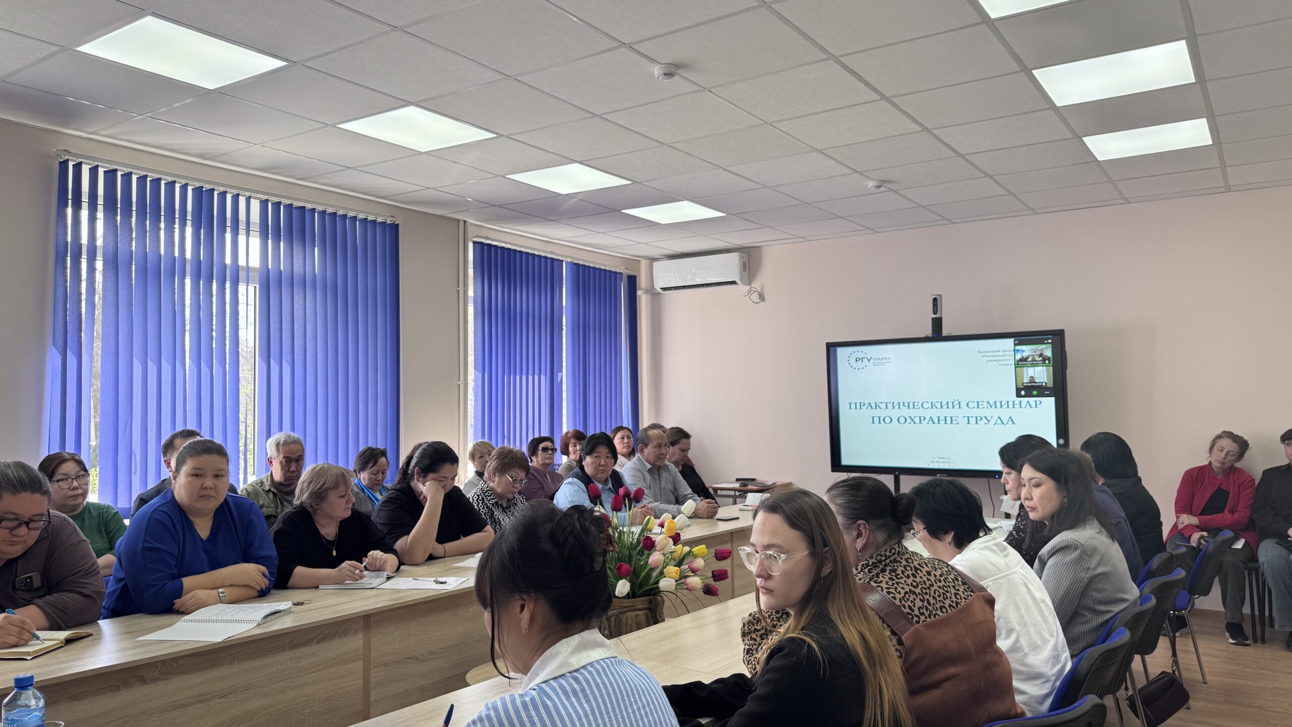 В целях ознакомления педагогических работников и сотрудников с вопросами обеспечения безопасности труда, предупреждения производственного травматизма и профессиональных заболеваний 02 апреля 2026 года в КФ РГУ СоцТех состоялся практический семинар по охране труда. Во время мероприятия спикеры — Валерия Александровна Ханинова, начальник отдела охраны труда Министерства социального развития, труда и занятости Республики Калмыкия, Савр Евгеньевич Матвенов, начальник отдела – главный государственный инспектор труда Нижневолжской межрегиональной территориальной государственной инспекции труда в Волгоградской, Астраханской областях и в Республике Калмыкия, Владимир Николаевич Бадмаев, заведующий отделом охраны труда Республиканского комитета Профсоюза работников образования Республики Калмыкия – ознакомили с изменениями в организации охраны труда в 2026 году в образовательных организациях; акцентировали особое внимание на обязанностях и ответственности работника по соблюдению требований охраны труда и трудового распорядка; дали ценные рекомендации по привлечению профкома к созданию условий охраны труда и безопасности в филиале. В завершение Николай Витальевич Мошкин, специалист по охране труда РГУ СоцТех, проинформировал о порядке ведения журналов по технике безопасности.