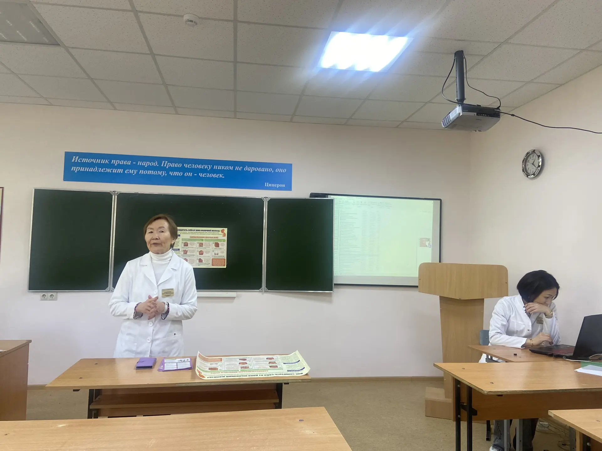 В рамках «Недели борьбы с раком молочной железы», корпоративной программы «Здоровье» 16 октября 2025 года в КФ РГУ СоцТех состояласьвстреча преподавателей и сотрудников с врачом БУ РК РЦСВМП № 2 «Сулда» Улюмжановой К.К., посвященная одной из самых актуальных тем женского здоровья — профилактике рака молочной железы. Рак молочной железы занимает первое место среди всех онкологических заболеваний у женщин. Однако современная медицина обладает мощным инструментом против этой болезни — ее ранней диагностикой. Именно на этом Кармен Константиновна сделала особый акцент во время мероприятия. В завершение присутствующие просмотрели видеоролик, как правильно женщинам разного возраста проводить обследование груди в домашних условиях.