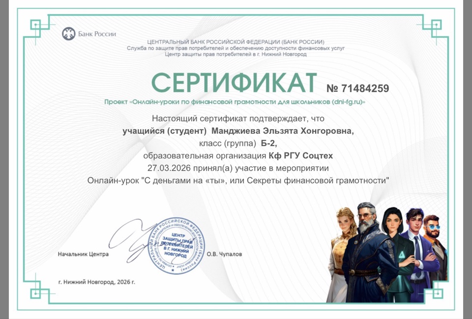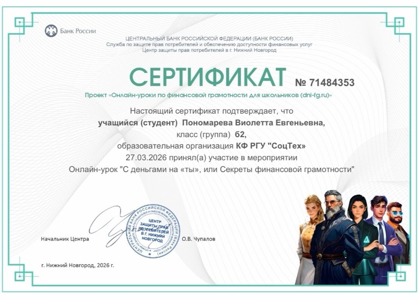 В целях повышения финансовой грамотности 27 марта 2026 года студенты КФ РГУ СоцТех специальности Экономика и бухгалтерский учет (по отраслям) приняли участие в онлайн уроке «Секреты финансовой грамотности», организатором которого выступает Центральный банк Российской Федерации.