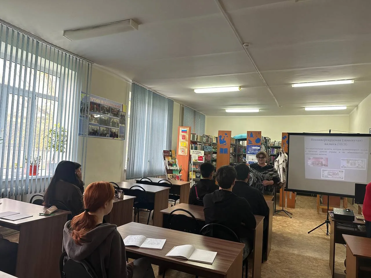 22 апреля 2026 года преподавателем КФ РГУ СоцТех Тарасенко Г.А. совместно с заведующим библиотекой Бевиновой И.В. в группе Л-2 специальности 38.02.03 Операционная деятельность в логистике проведен совместный урок по дисциплине «Финансы, денежные обращение и кредит» по теме «Валюта и валютные отношения».