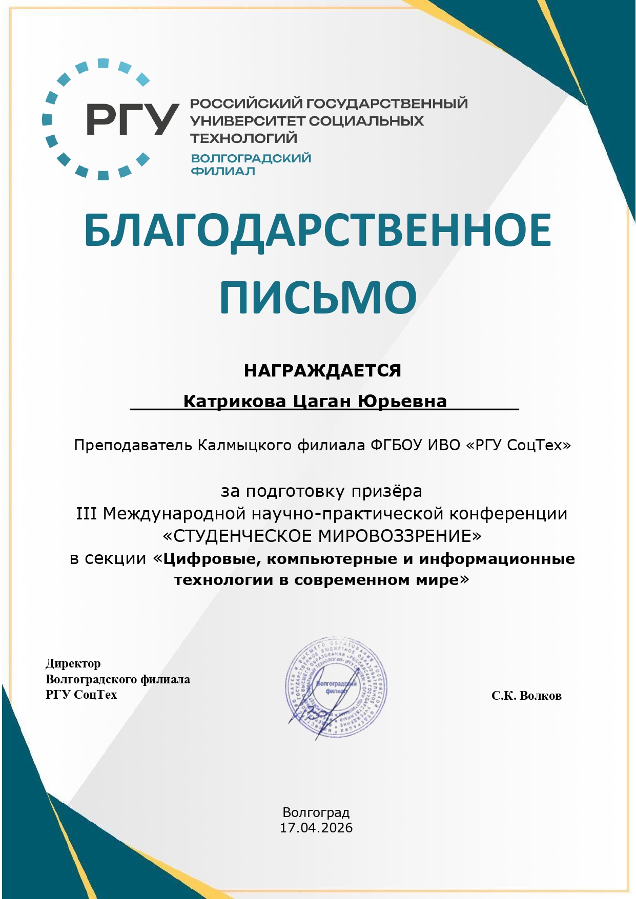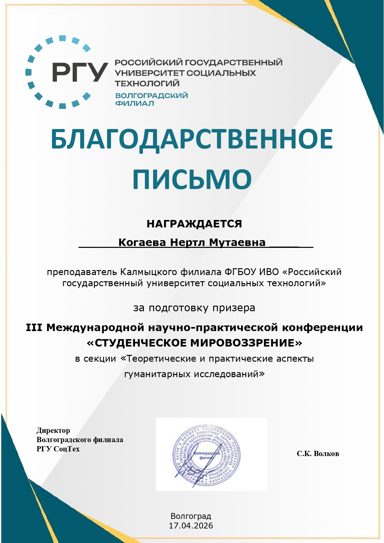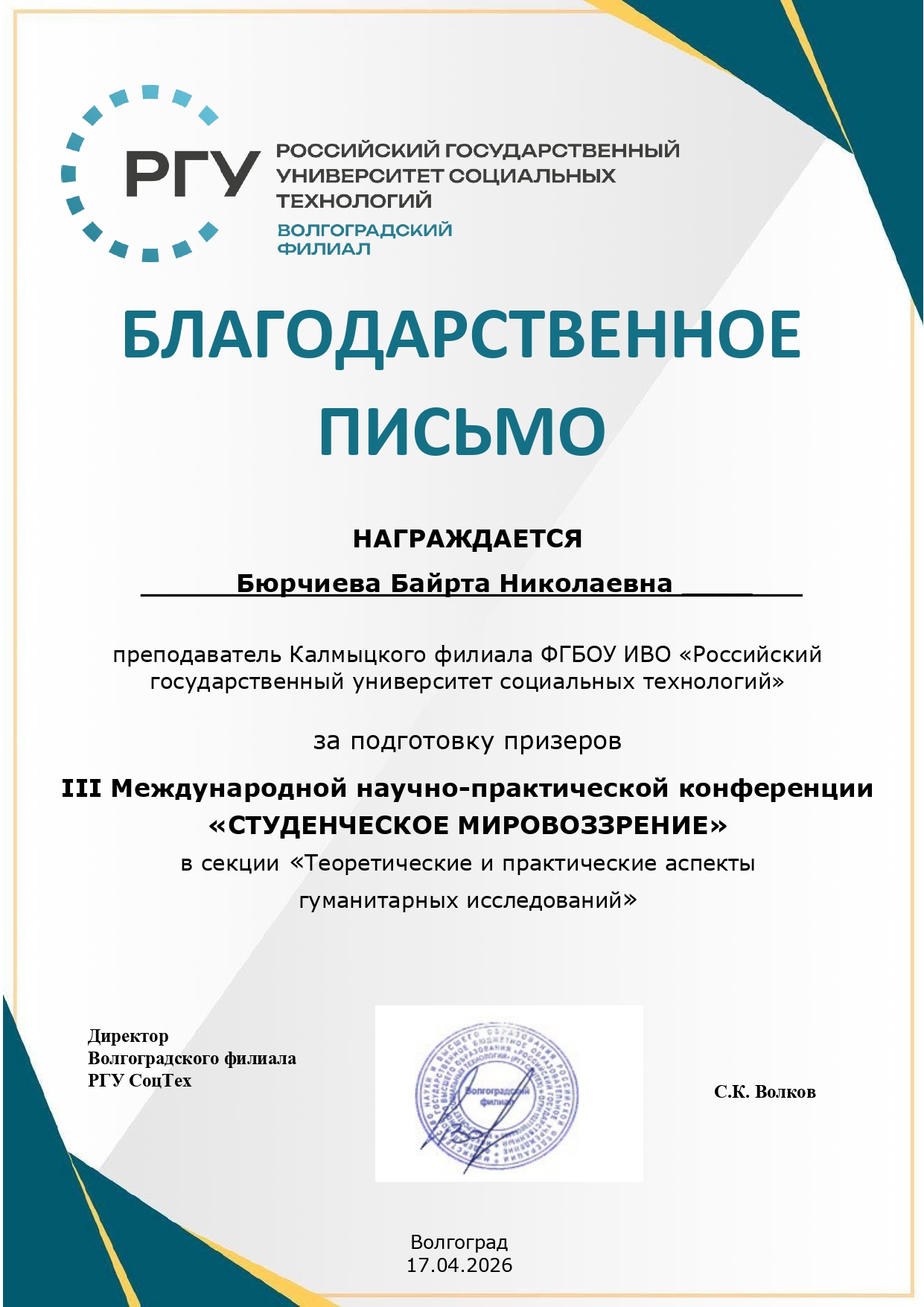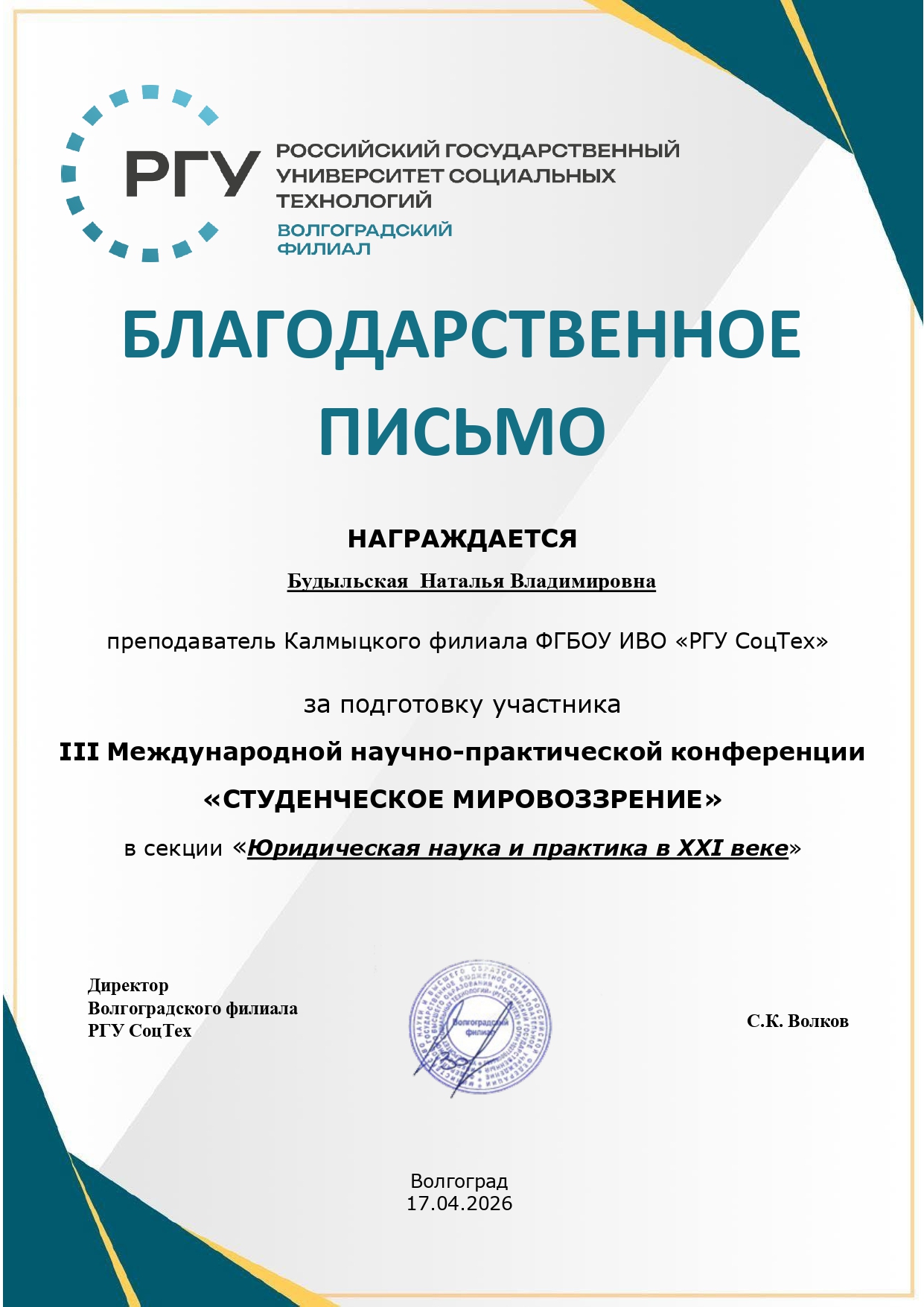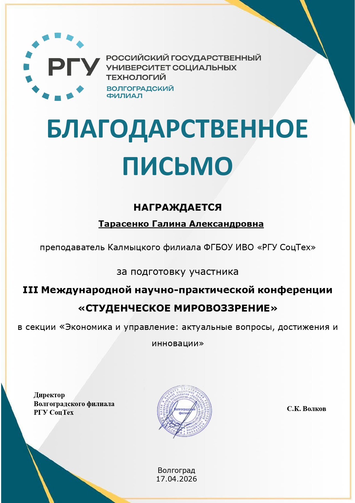 Волгоградский филиал РГУ СоцТех выражает благодарность всем участникам, научным руководителям за вклад в развитие студенческой науки и ждёт новых встреч на следующих конференциях.