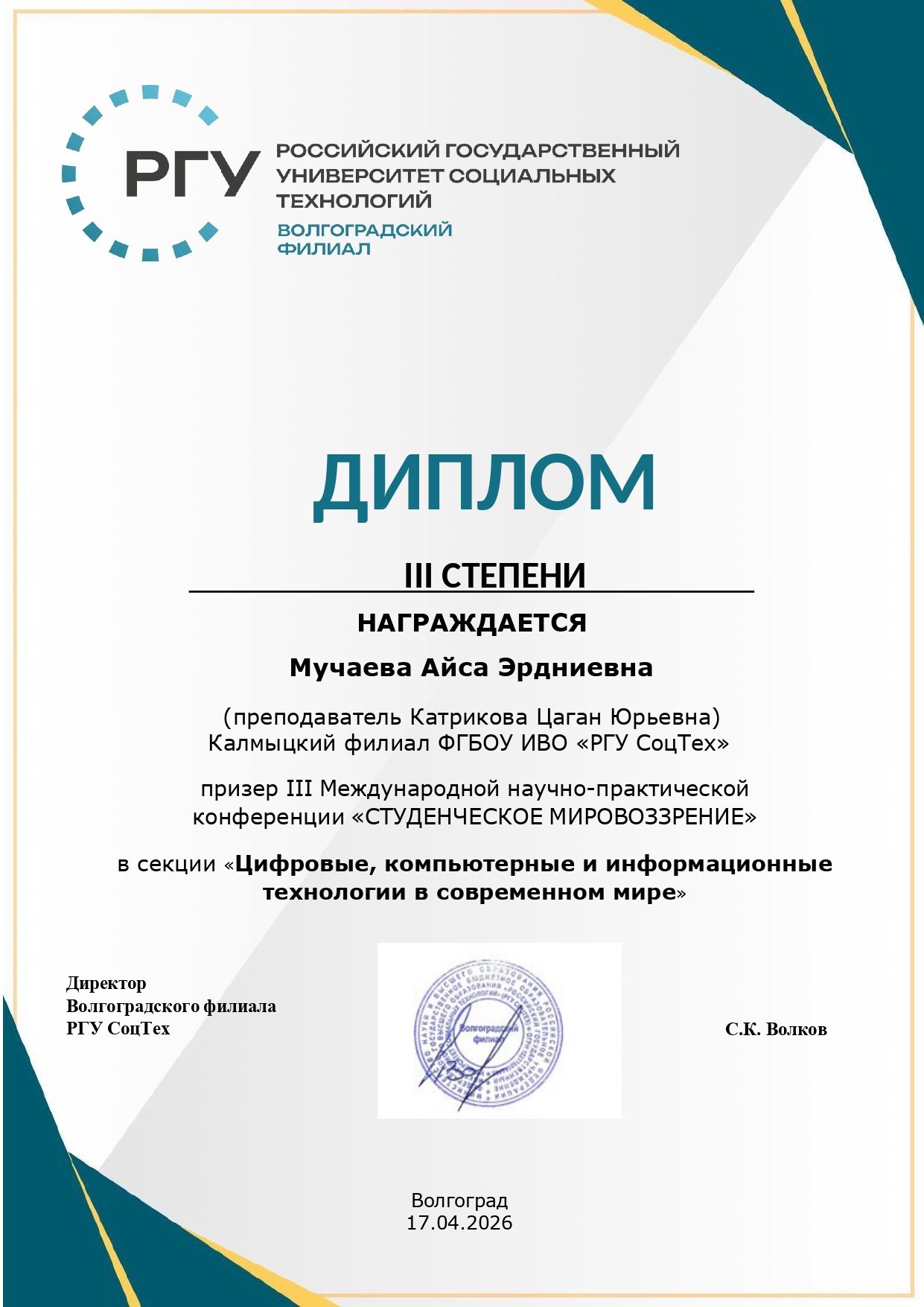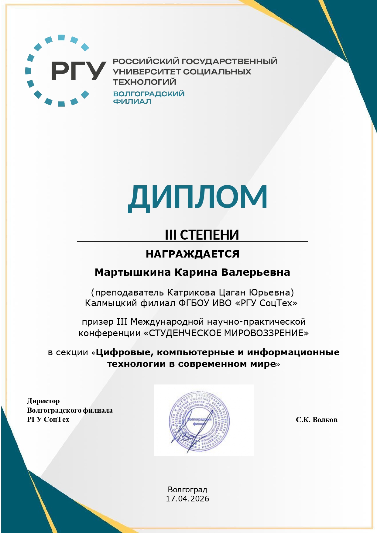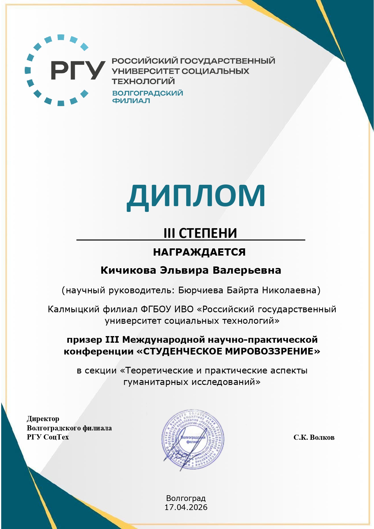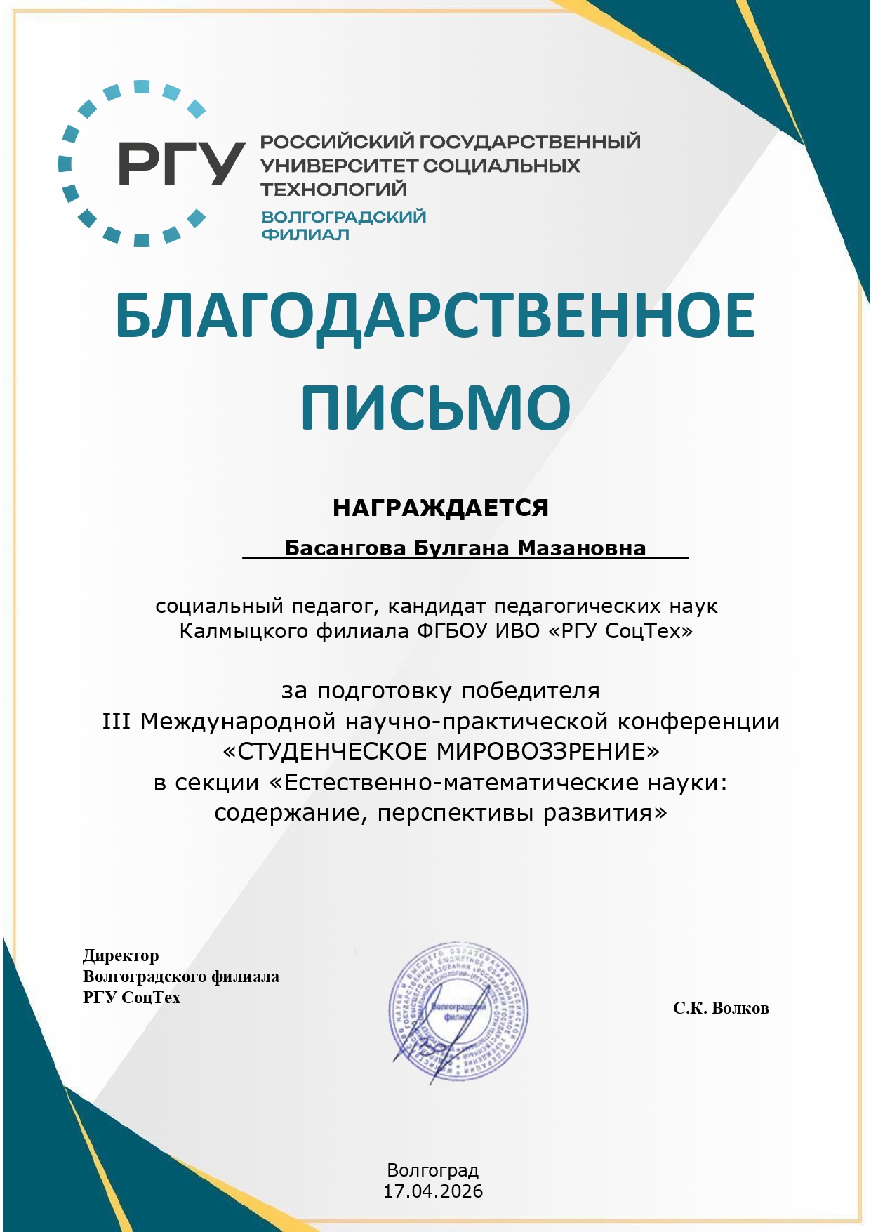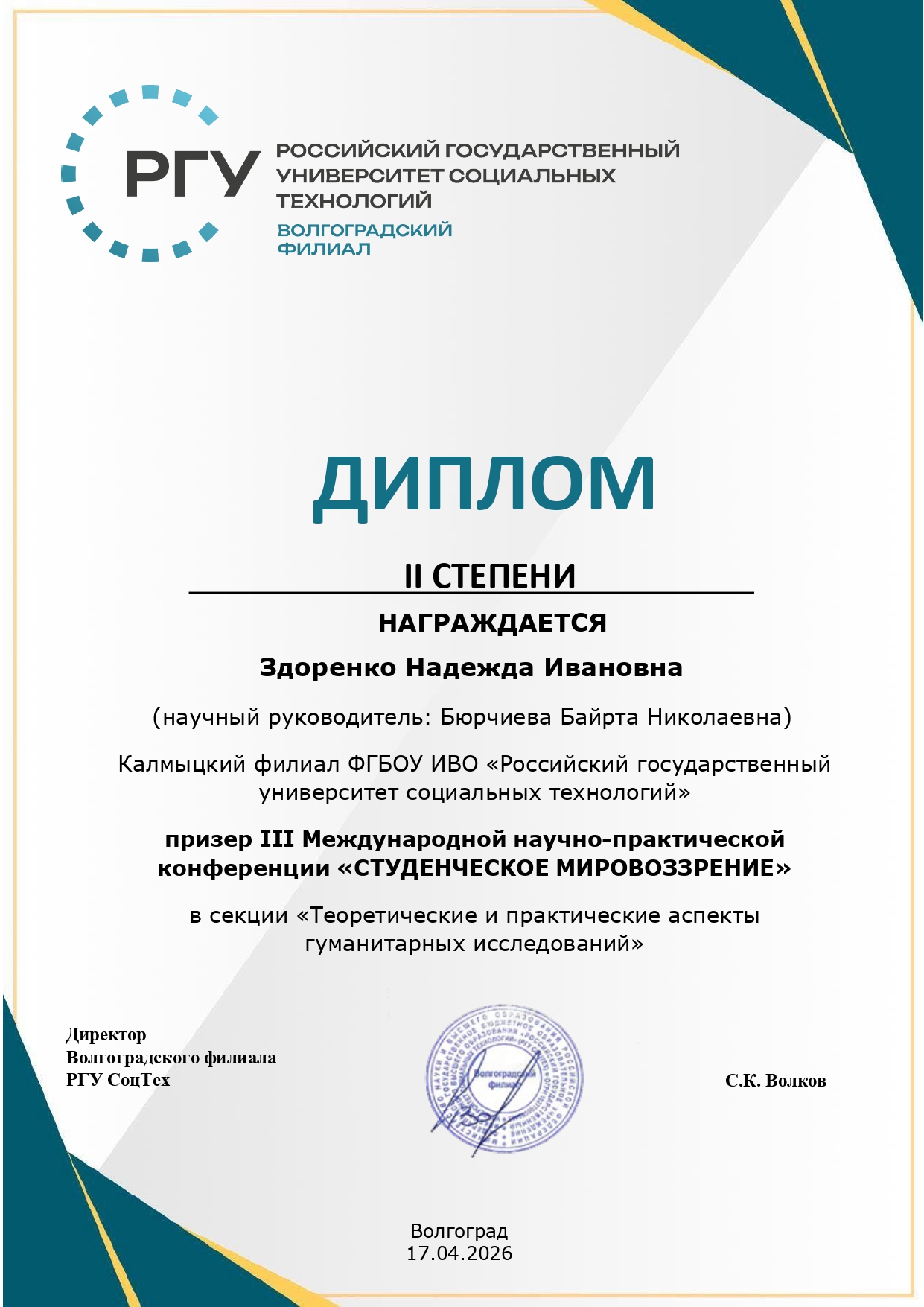 Волгоградский филиал РГУ СоцТех выражает благодарность всем участникам, научным руководителям за вклад в развитие студенческой науки и ждёт новых встреч на следующих конференциях.