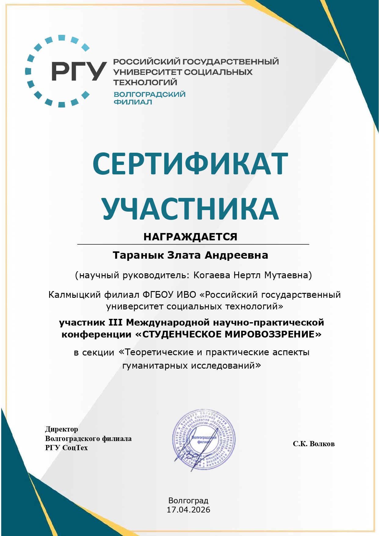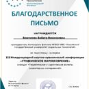 сертификат участника – Таранык З., секция «Теоретические и практические аспекты гуманитарных исследований», руководитель Когаева Н.М.;