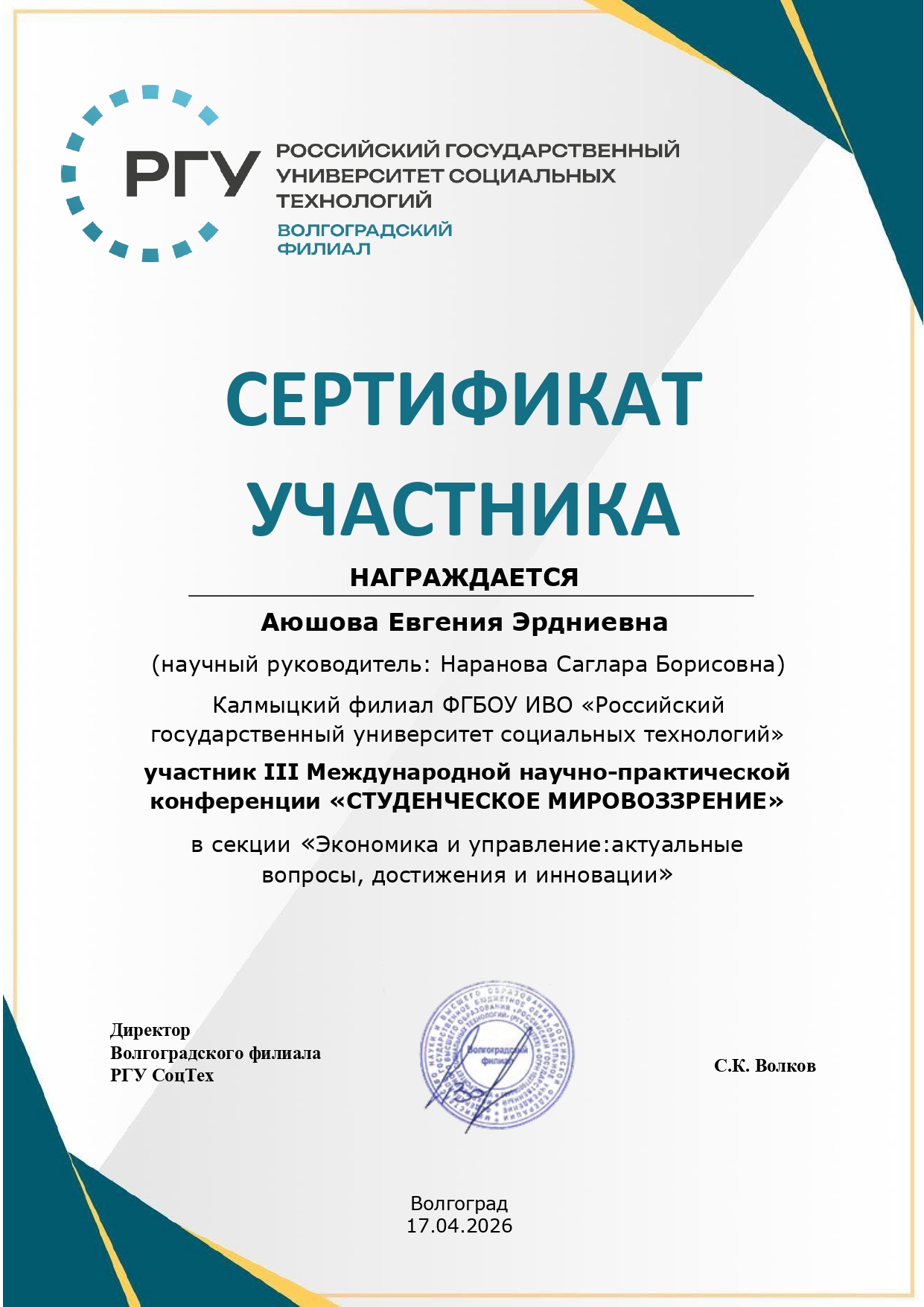сертификат участника – Дорджиева Ц., секция «Экономика и управление: актуальные вопросы, достижения и инновации», руководитель Кийкова Л.И.;