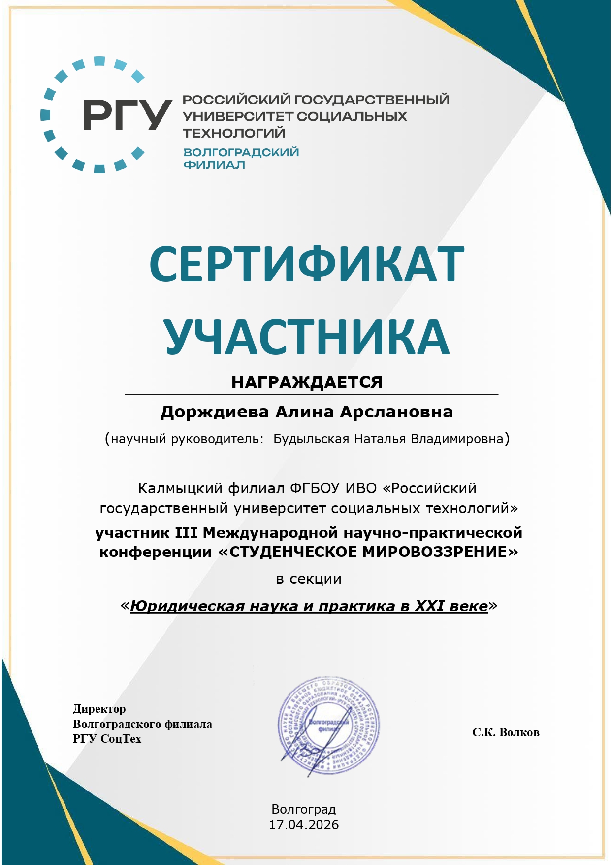 сертификат участника – Дорджиева А., секция «Юридическая наука и практика в XXI веке», руководитель Будыльская Н.В.