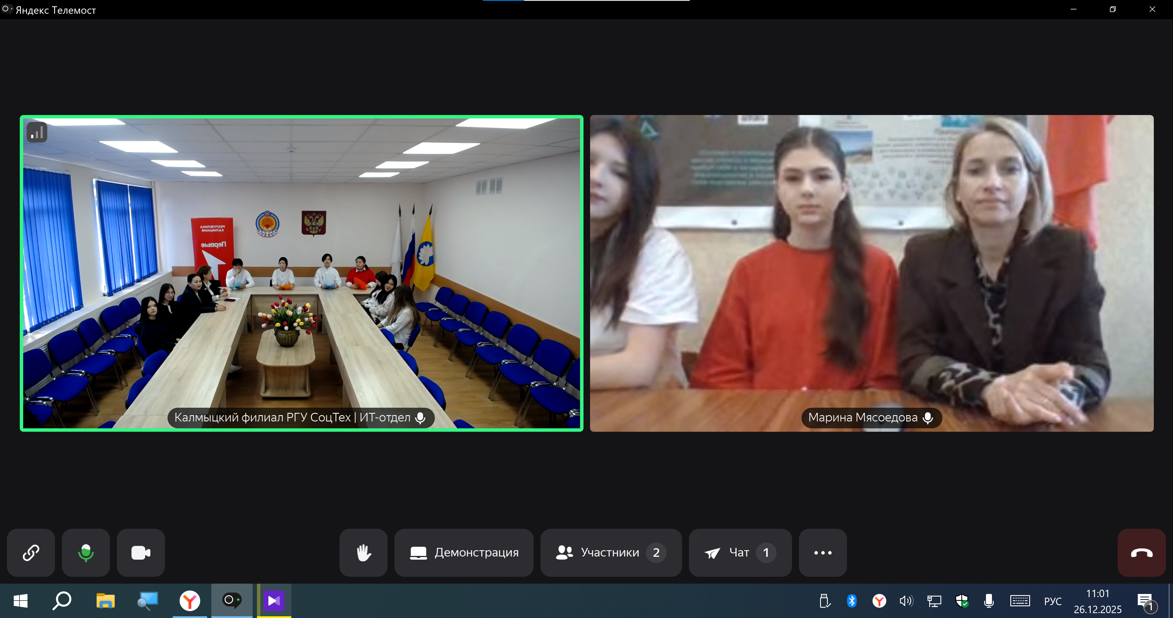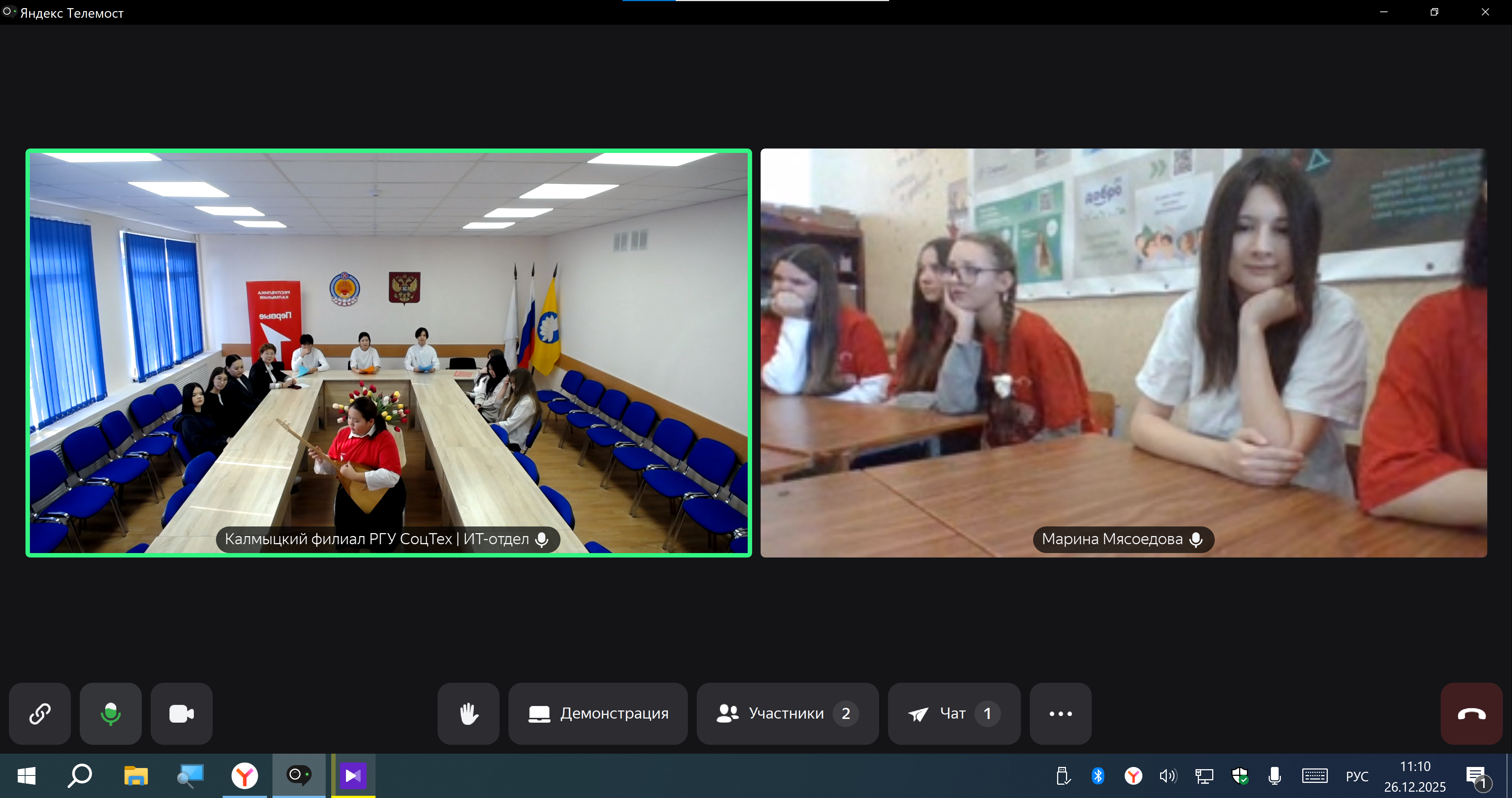 26 декабря 2025 года состоялся телемост «Мост дружбы», который в прямом эфире объединил активистов Движения Первых КФ РГУ СоцТех и Антрацитовского колледжа информационных технологий и экономики. Первые из Элисты познакомили своих новых друзей с культурными традициями Калмыкии, подробно рассказав о национальном празднике Зул, его глубоком смысле и традициях, поделились атмосферой праздника и его значением для сохранения национальной идентичности. Первые из Антрацита поделились опытом волонтёрской помощи пожилым жителям, участием в экологических субботниках и личным вкладом в благоустройство своей малой родины. Их истории — это пример реальных дел и гражданской ответственности. Этот телемост стал мостом не только между людьми, но и между идеями, культурами и возможностями. Мы уверены, что это только начало большой совместной работы. Впереди у наших команд — реализация новых совместных проектов и, конечно, новые встречи.