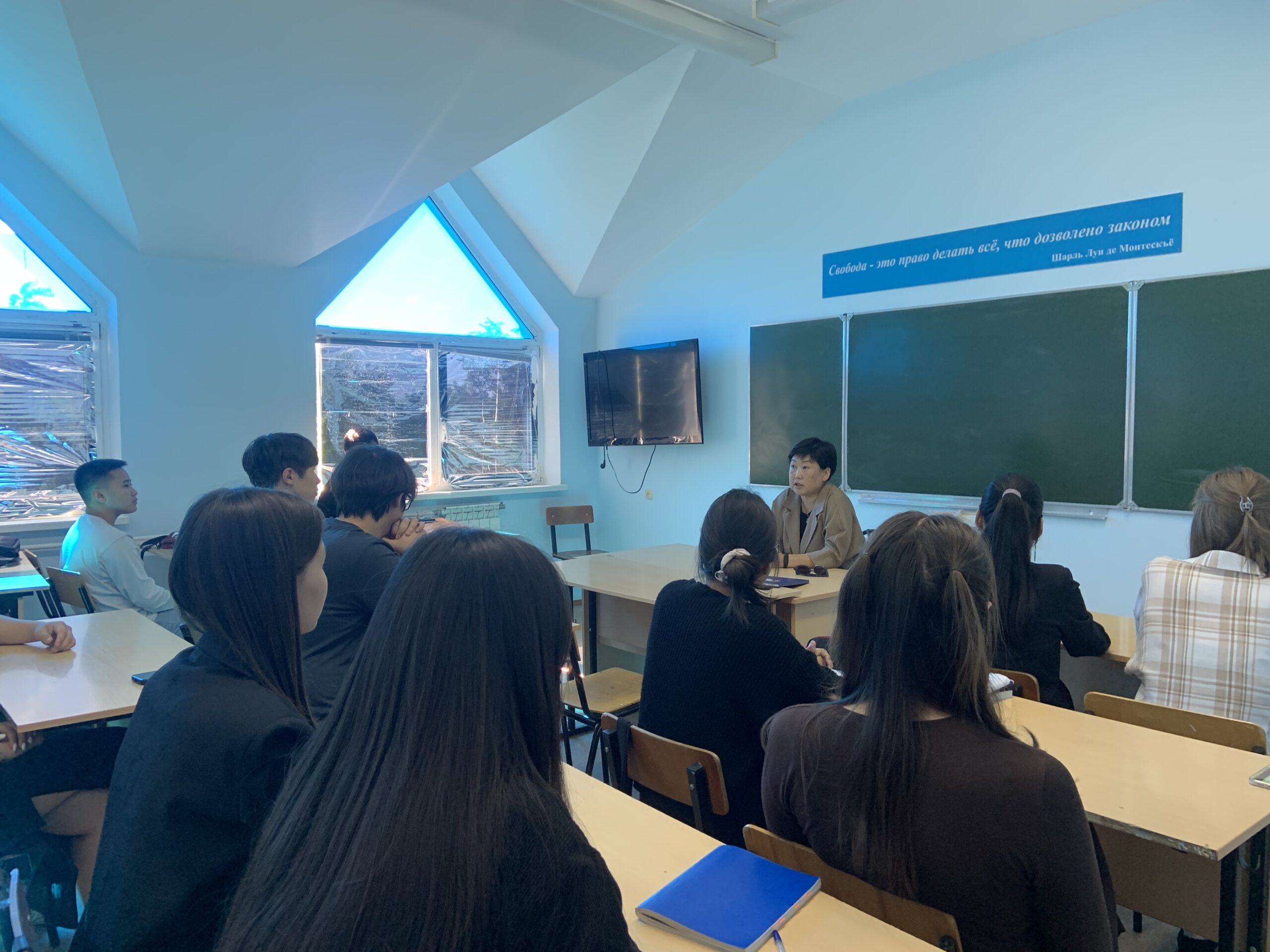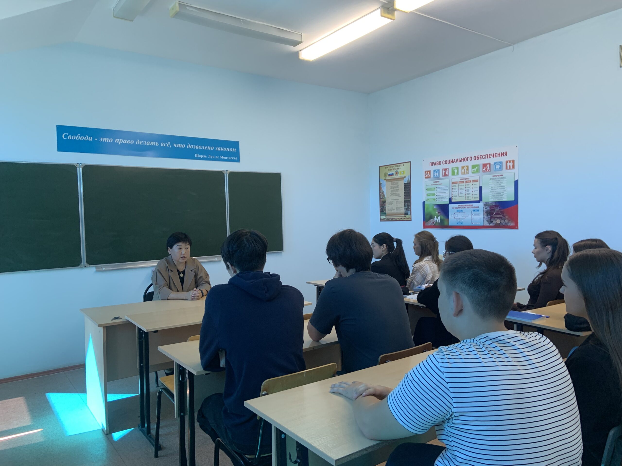 В рамках Договора о сотрудничестве 24 сентября 2025 года преподавателем Сангаджиевой Э. Н. совместно с начальником отдела по работе с семьей и детьми КУ РК «Центр социальной защиты города Элисты» Мучкаевой А. Б. проведен урок на тему «Государственная социальная помощь» по ПМ.01 МДК.01.01. Право социального обеспечения в группе ПС-3 специальности «Право и организация социального обеспечения». В ходе занятия студенты ознакомились с практическими аспектами оказания государственной социальной помощи многодетным семьям и малообеспеченным гражданам. Анна Борисовна подробно остановилась на особенностях использования средств регионального материнского капитала и оказания государственной помощи в виде социального контракта, а также ответила на интересующие вопросы о трудоустройстве в КУ РК «Центр социальной защиты города Элисты».