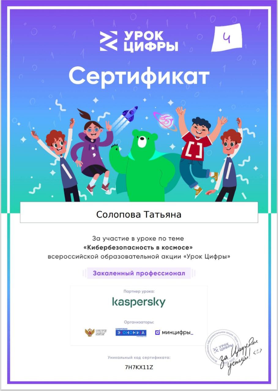 26 января 2026 года студенты приняли участие во Всероссийском образовательном проекте в сфере информационных технологий Урок цифры «Кибербезопасность в космосе». В ходе занятия они узнали, как защищают спутники и космические станции от кибератак, почему важно шифровать данные при передаче с орбиты на Землю и какие угрозы могут нарушить работу бортовых систем. По завершении занятия все участники получили сертификаты, подтверждающие приобретённые знания.