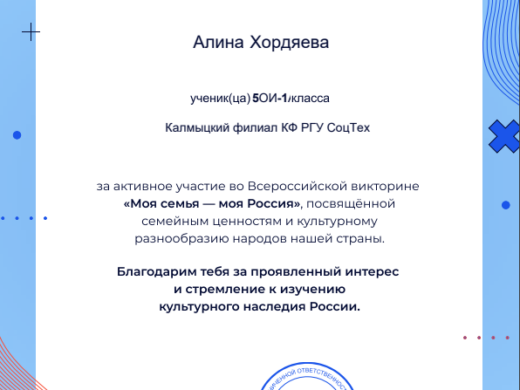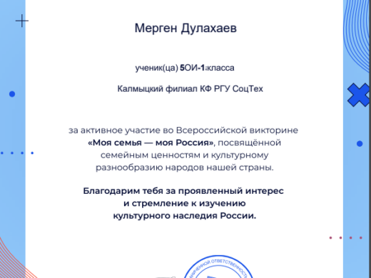 В ноябре 2024 года студенты КФ РГУ СоцТех приняли участие во Всероссийской викторине «Моя семья – моя Россия» для студентов СПО, проводимой в рамках Года семьи. Участвуя в викторине, активисты музея узнали много полезной информации о семейных традициях народов, проживающих в России.
