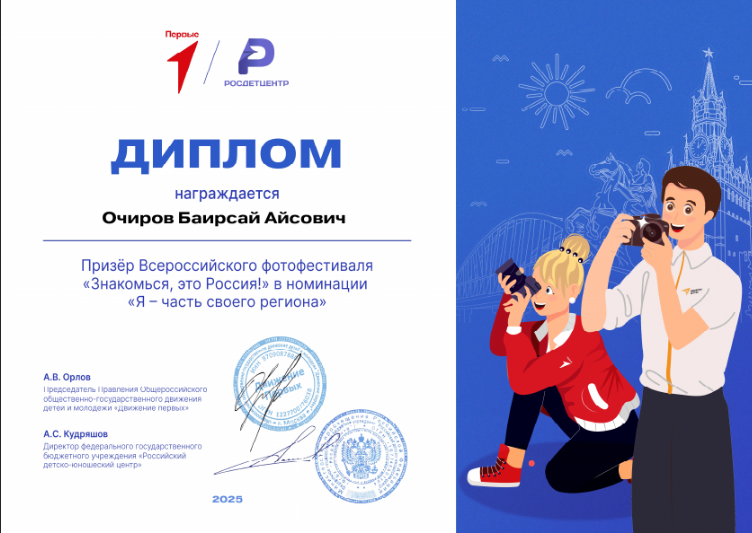 Подведены итоги Всероссийского фотофестиваля «Знакомься, это Россия!», организованного Движением Первых совместно с Росдетцентром. Цель конкурса — показать уникальную красоту и историческое наследие России, а также передать величие родного края через объектив камеры. Фестиваль призван помочь участникам рассказать об истории родного края, познакомить с его героями и сохранить память поколений. В фестивале приняли участие более 24 тысяч участников Движения Первых со всей России.