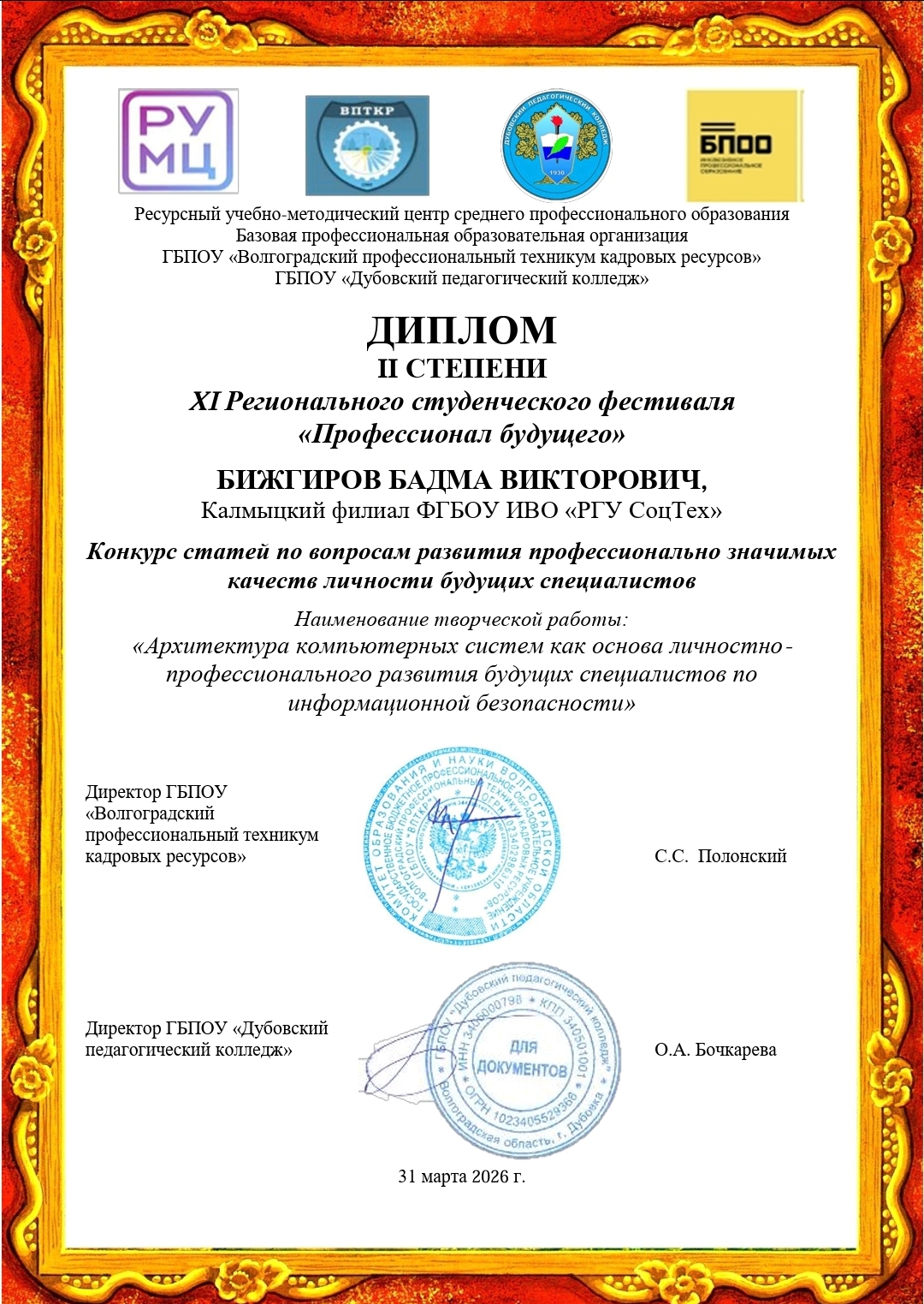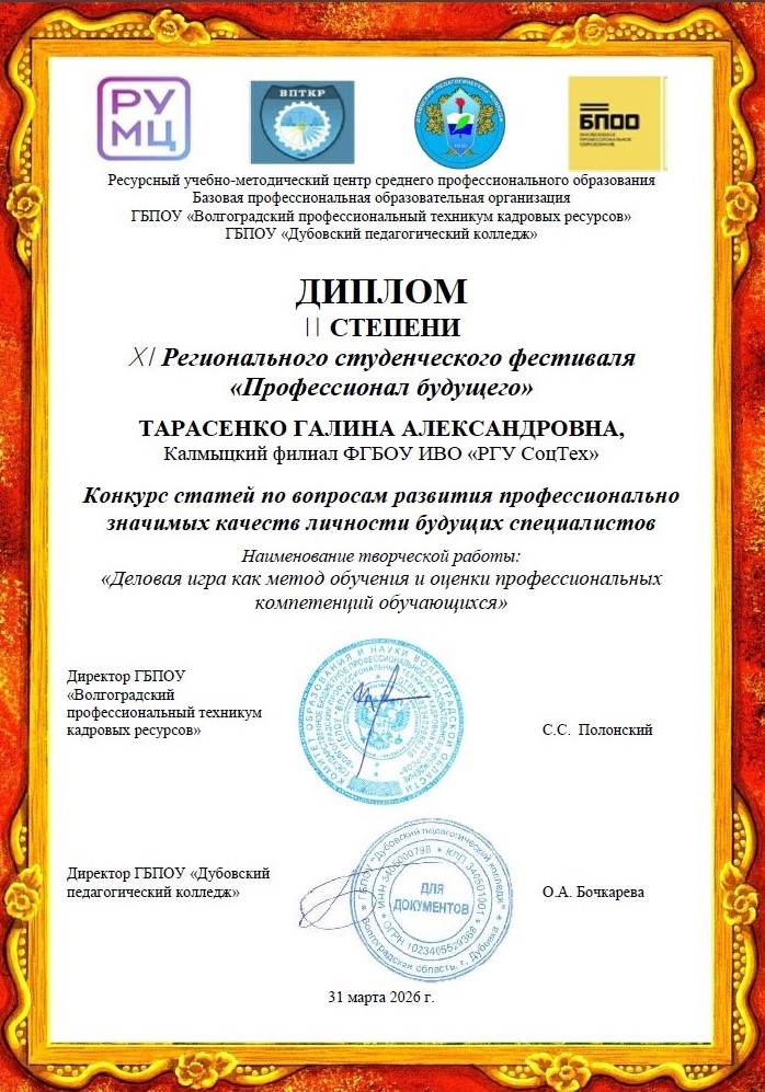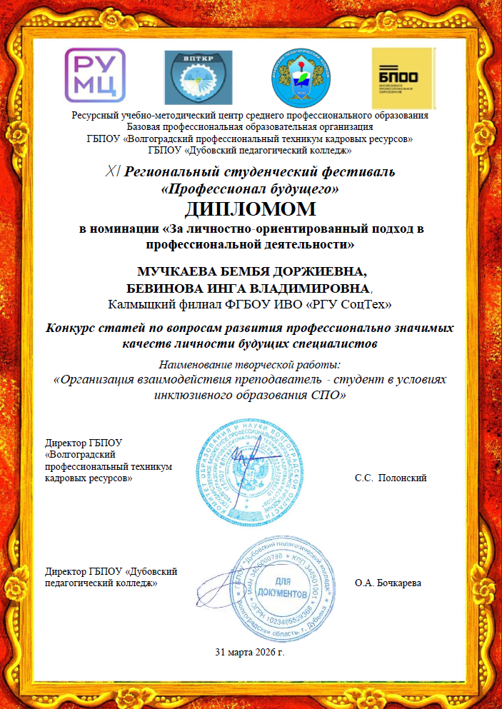 31 марта 2026 года на базе ГБПОУ «Дубовский педагогический колледж» прошёл XI региональный студенческий фестиваль «Профессионал будущего». В этом году мероприятие собрало педагогов и студентов учреждений среднего профессионального и общего образования Волгоградской области, в том числе обучающихся с ограниченными возможностями здоровья и инвалидностью.