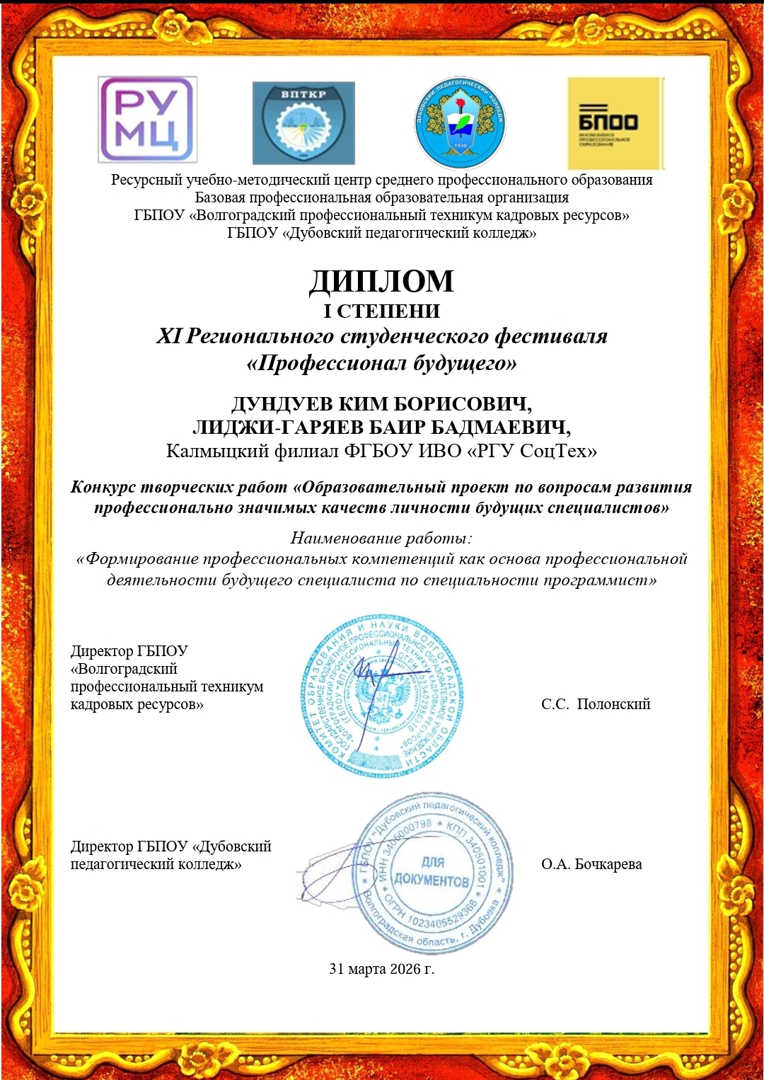 - Дундуев К. Б. и Лиджи-Гаряев Б. Б. заняли первое место в конкурсе образовательных проектов.