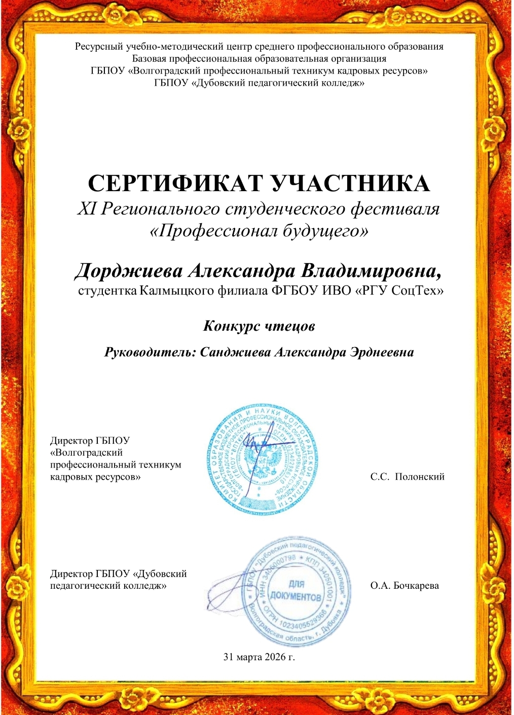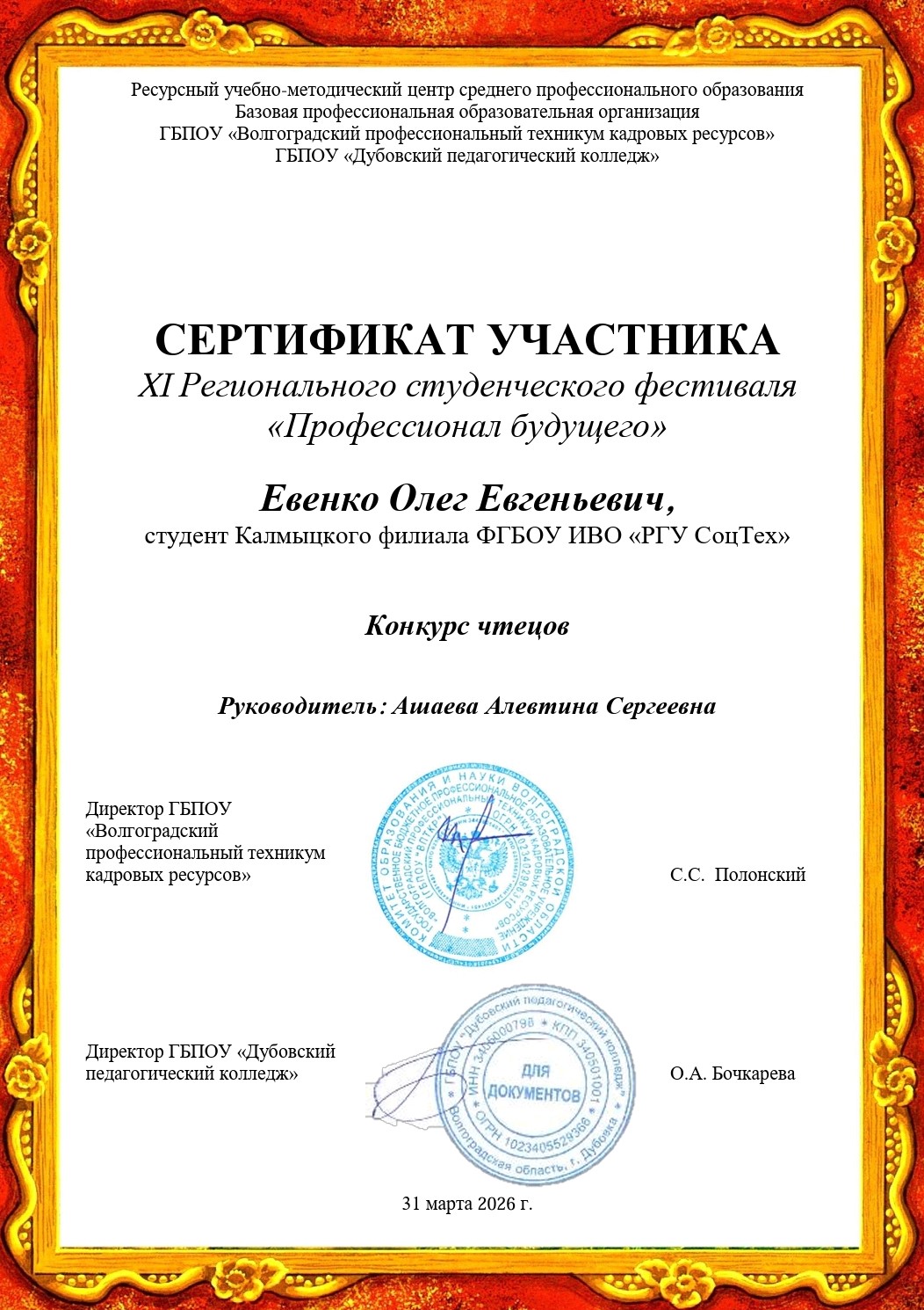 - Евенко О. Е. (руководитель Ашаева А. С.), Дорджиева А. В. и Элеева Э. А. (руководитель Санджиева А. Э.) получили сертификаты участников конкурса чтецов.