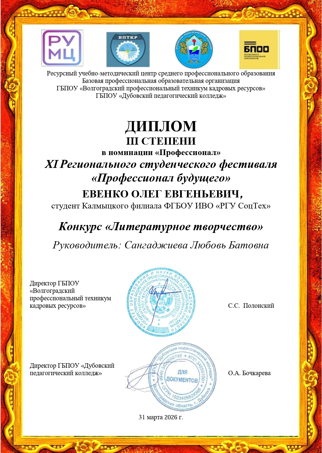 - Евенко О.Е. (руководитель Сангаджиева Л.Б.) отмечен дипломом III степени в номинации «Профессионал» в конкурсе «Литературное творчество»;