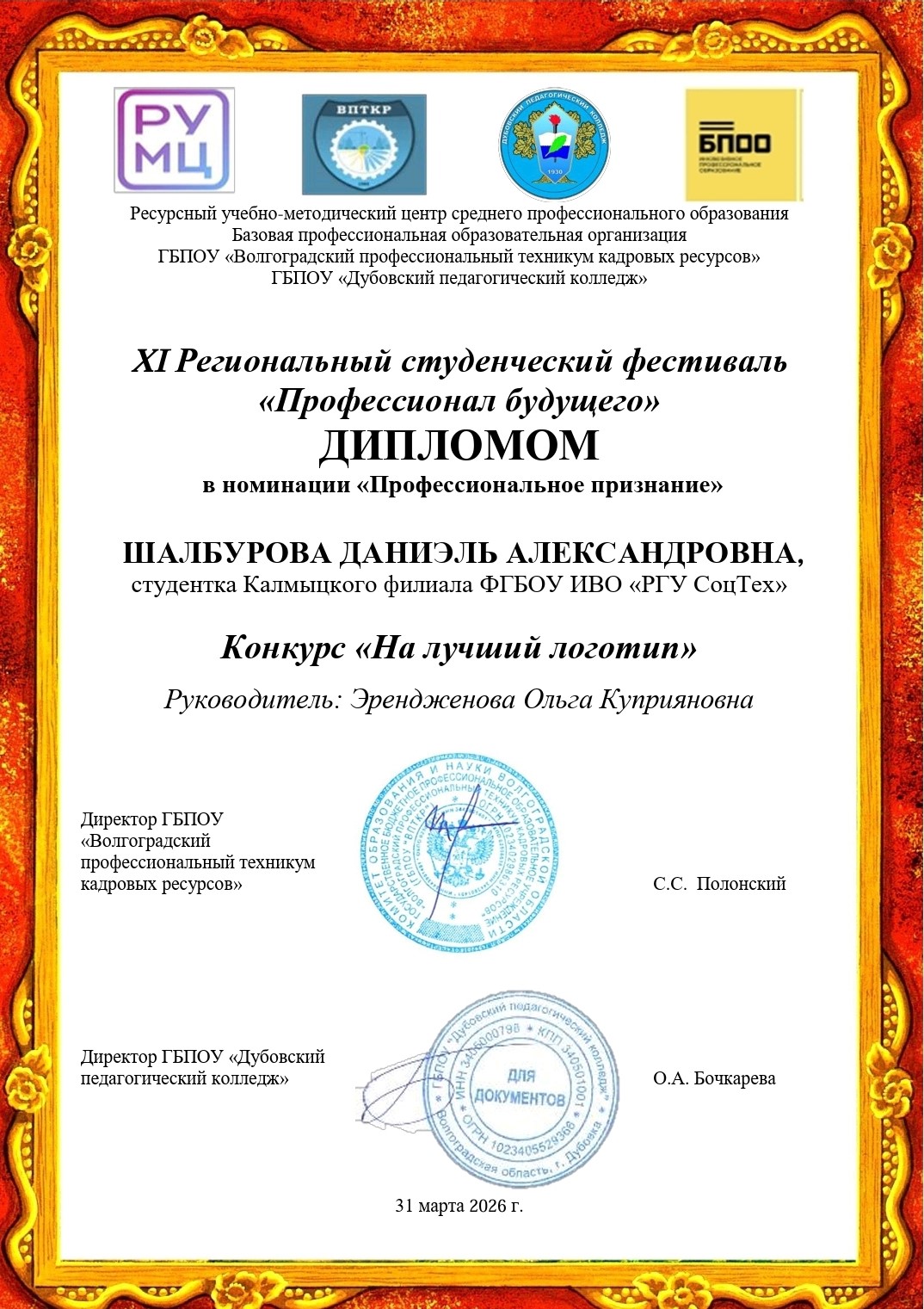 - Шалбурова Д. А. (руководитель Эрендженова О. К.), Хорванен Д.В. (Мучкаева Б.Д.) отмечены дипломом в номинации «Профессиональное признание» в конкурсе «На лучший логотип».