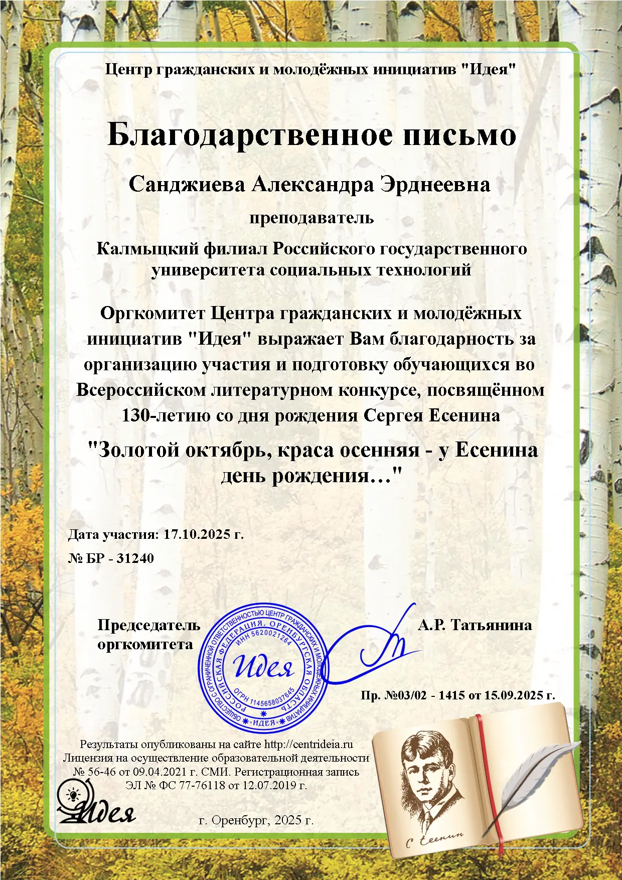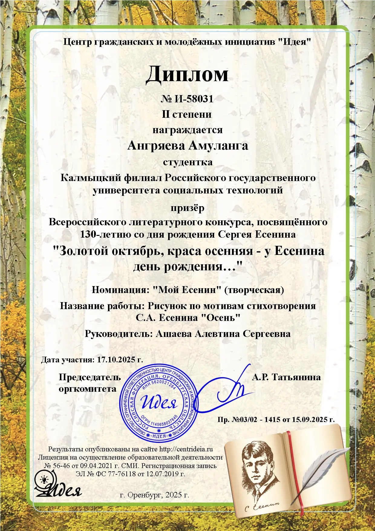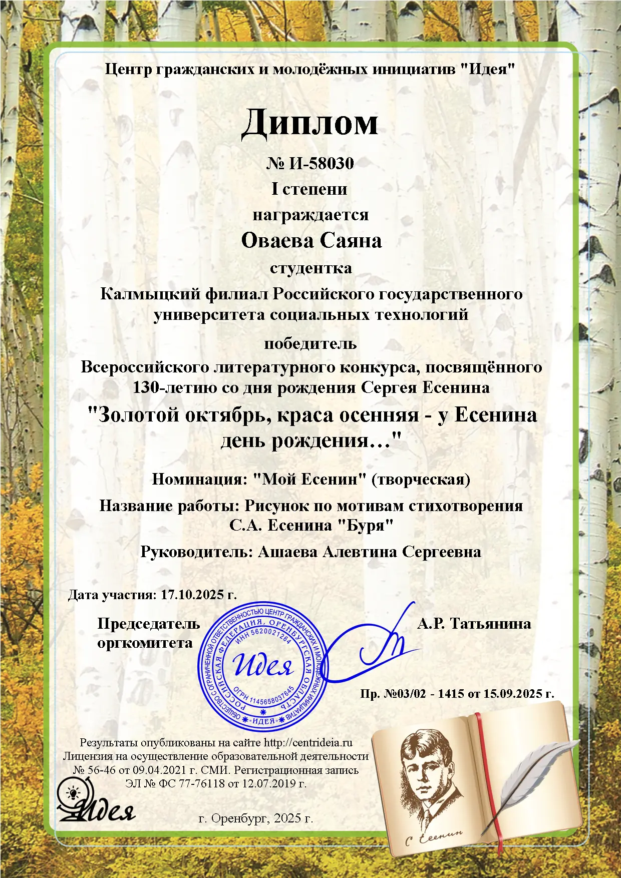 Студенты Калмыцкого филиала РГУ СоцТех стали победителями и призерами Всероссийского литературного конкурса, посвящённого 130-летию со дня рождения Сергея Есенина «Золотой октябрь, краса осенняя – у Есенина день рождения…». Целью конкурса было воспитание интереса к чтению и книге, потребности в общении с миром литературы, развитие творческого мышления обучающихся и повышение их познавательного уровня. Молодые люди участвовали в номинациях «Мой Есенин», «Я читаю стихи Есенина…» и получили признание за свои достижения в области поэзии и художественного творчества. Дипломы 1 степени – Евенко Олег, гр. ОИ-1Б, Оваева Саяна, гр.П-1Б, Диплом 2 степени – Ангряева Амуланга, гр.ОИ-1Б — руководитель Ашаева А.С.; Диплом 1 степени – Валендер Елизавета, гр.Ю-1Б — руководитель Санджиева А.Э. Поздравляем с успехами!